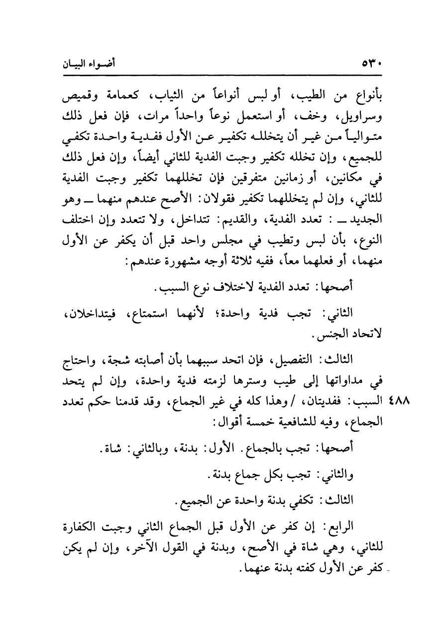 بأنواع من الطيب، أو لبس أنواعًا من الثياب، كعمامة وقميص وسراويل، وخف، أو استعمل نوعًا واحدًا مرات، فإن فعل ذلك متواليًا من غير أن يتخلله تكفير عن الأول ففدية واحدة تكفي للجميع، وإن تخلله تكفير وجبت الفدية للثاني أيضًا، وإن فعل ذلك في مكانين، أو زمانين متفرقين فإن تخللهما تكفير وجبت الفدية للثاني، وإن لم يتخللهما تكفير فقولان: الأصح عندهم منهما - وهو الجديد - : تعدد الفدية، والقديم: تتداخل، ولا تتعدد وإن اختلف النوع، بأن لبس وتطيب في مجلس واحد قبل أن يكفر عن الأول منهما، أو فعلهما معًا، ففيه ثلاثة أوجه مشهورة عندهم.