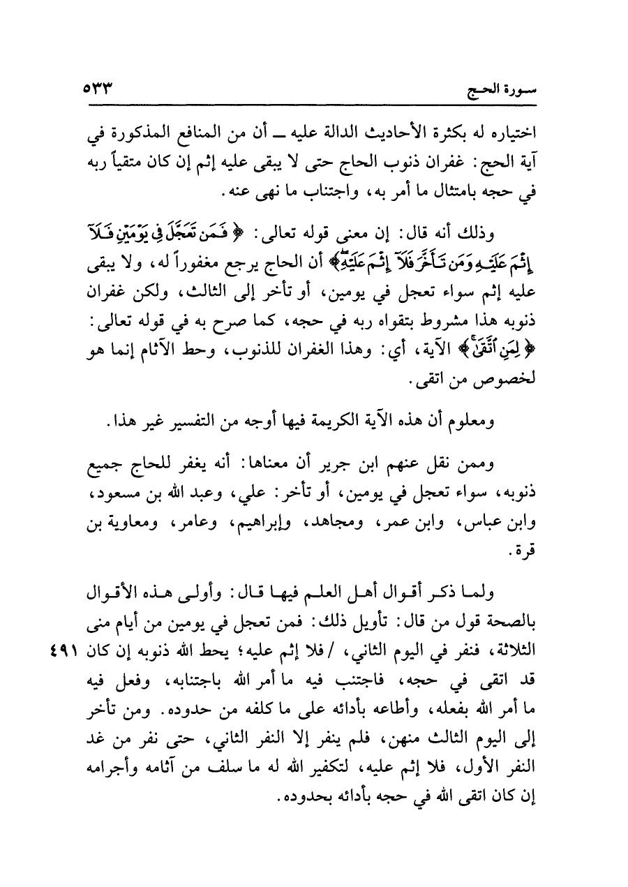 اختياره له بكثرة الأحاديث الدالة عليه - أن من المنافع المذكورة في آية الحج: غفران ذنوب الحاج حتى لا يبقى عليه إثم إن كان متقيًا ربه في حجه بامتثال ما أمر به، واجتناب ما نهى عنه.