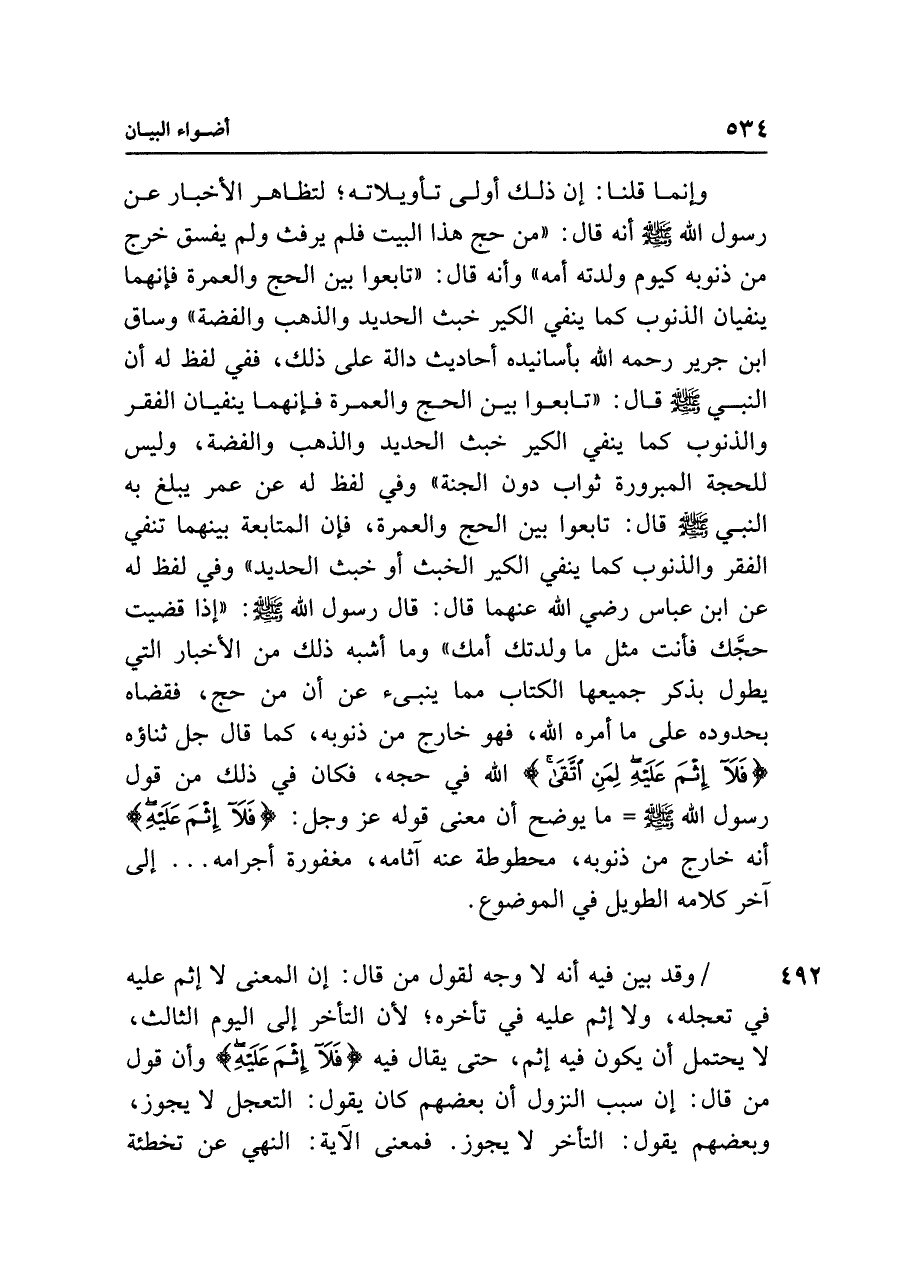 وإنما قلنا: إن ذلك أولى تأويلاته؛ لتظاهر الأخبار عن رسول الله - صلى الله عليه وسلم - أنه قال: "من حج هذا البيت فلم يرفث ولم يفسق خرج من ذنوبه كيوم ولدته أمه" وأنه قال: "تابعوا بين الحج والعمرة فإنهما ينفيان الذنوب كما ينفي الكير خبث الحديد والذهب والفضة" وساق ابن جرير رحمه الله بأسانيده أحاديث دالة على ذلك، ففي لفظ له أن النبي - صلى الله عليه وسلم - قال: "تابعوا بين الحج والعمرة فإنهما ينفيان الفقر والذنوب كما ينفي الكير خبث الحديد والذهب والفضة، وليس للحجة المبرورة ثواب دون الجنة" وفي لفظ له عن عمر يبلغ به النبي - صلى الله عليه وسلم - قال: تابعوا بين الحج والعمرة، فإن المتابعة بينهما تنفي الفقر والذنوب كما ينفي الكير الخبث أو خبث الحديد" وفي لفظ له عن ابن عباس رضي الله عنهما قال: قال رسول الله - صلى الله عليه وسلم - : "إذا قضيت حجَّك فأنت مثل ما ولدتك أمك" وما أشبه ذلك من الأخبار التي يطول بذكر جميعها الكتاب مما ينبيء عن أن من حج، فقضاه بحدوده على ما أمره الله، فهو خارج من ذنوبه، كما قال جل ثناؤه {فَلَا إِثْمَ عَلَيْهِ لِمَنِ اتَّقَى} الله في حجه، فكان في ذلك من قول رسول الله - صلى الله عليه وسلم - = ما يوضح أن معنى قوله عزَّ وجلَّ: {فَلَا إِثْمَ عَلَيْهِ} أنه خارج من ذنوبه، محطوطة عنه آثامه، مغفورة أجرامه. . . إلى آخر كلامه الطويل في الموضوع.
