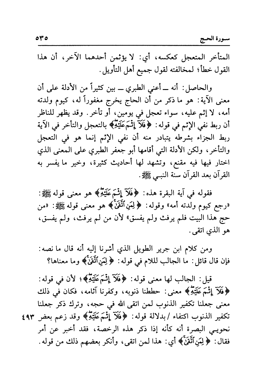 والحاصل: أنه - أعني الطبري - بين كثيرًا من الأدلة على أن معنى الآية: هو ما ذكر من أن الحاج يخرج مغفورًا له، كيوم ولدته أمه، لا إثم عليه، سواء تعجل في يومين، أو تأخر. وقد يظهر للناظر أن ربط نفي الإِثم في قوله: {فَلَا إِثْمَ عَلَيْهِ} بالتعجل والتأخر في الآية ربط الجزاء بشرطه يتبادر منه أن نفي الإِثم إنما هو في التعجل والتأخر، ولكن الأدلة التي أقامها أبو جعفر الطبري على المعنى الذي اختار فيها فيه مقنع، وتشهد لها أحاديث كثيرة، وخير ما يفسر به القرآن بعد القرآن سنة النبي - صلى الله عليه وسلم -.