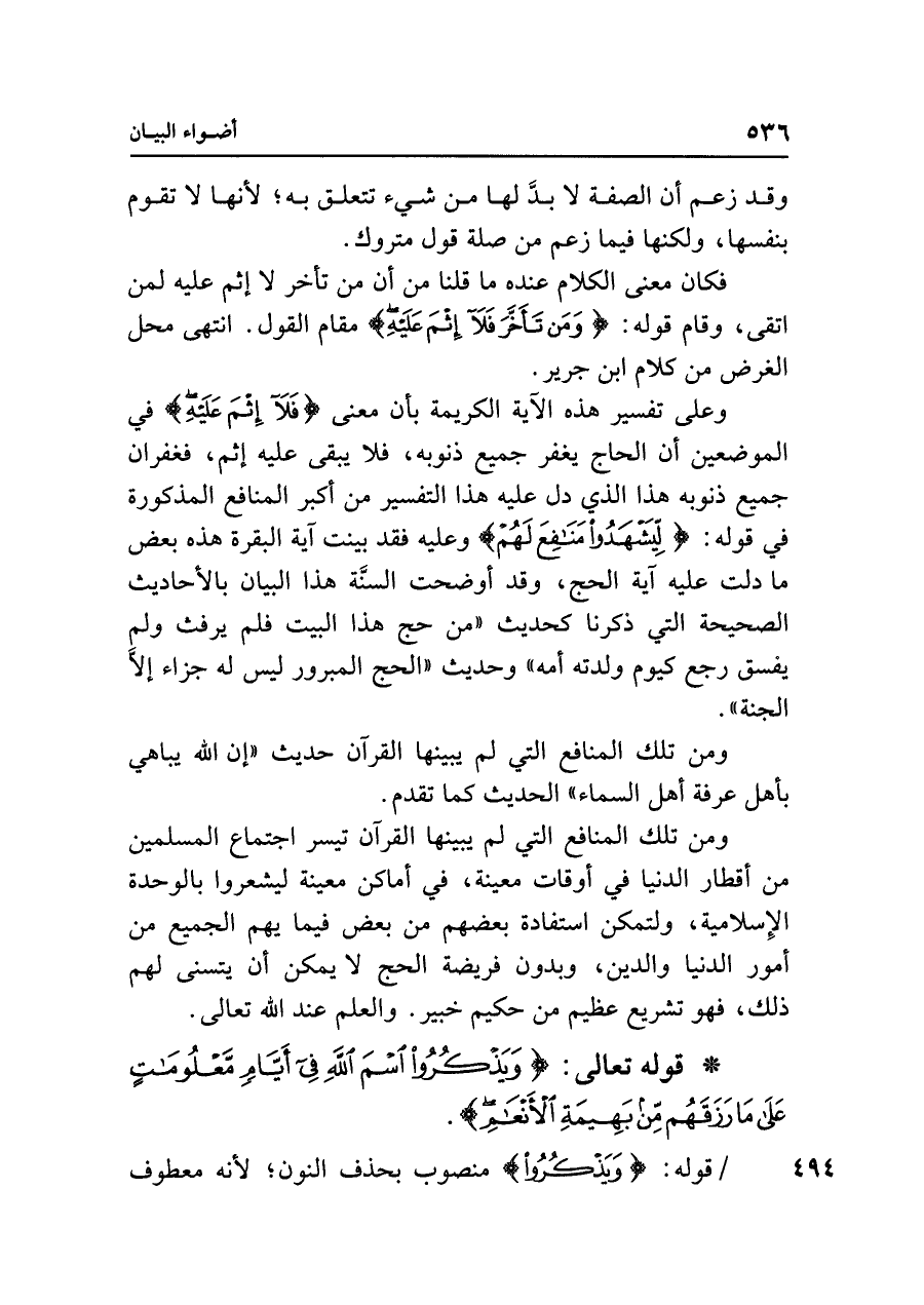 وعلى تفسير هذه الآية الكريمة بأن معنى {فَلَا إِثْمَ عَلَيْهِ} في الموضعين أن الحاج يغفر جميع ذنوبه، فلا يبقى عليه إثم، فغفران جميع ذنوبه هذا الذي دل عليه هذا التفسير من أكبر المنافع المذكورة في قوله: {لِيَشْهَدُوا مَنَافِعَ لَهُمْ} وعليه فقد بينت آية البقرة هذه بعض ما دلت عليه آية الحج، وقد أوضحت السنَّة هذا البيان بالأحاديث الصحيحة التي ذكرنا كحديث "من حج هذا البيت فلم يرفث ولم يفسق رجع كيوم ولدته أمه" وحديث "الحج المبرور ليس له جزاء إلَّا الجنة".
