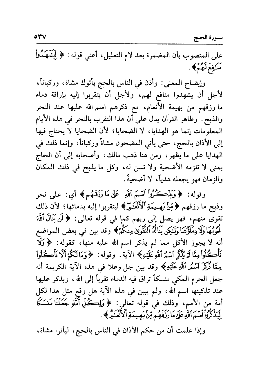 وإيضاح المعنى: وأذن في الناس بالحج يأتوك مشاة، وركبانًا، لأجل أن يشهدوا منافع لهم، ولأجل أن يتقربوا إليه بإراقة دماء ما رزقهم من بهيمة الأنعام، مع ذكرهم اسم الله عليها عند النحر والذبح. وظاهر القرآن يدل على أن هذا التقرب بالنحر في هذه الأيام المعلومات إنما هو الهدايا، لا الضحايا؛ لأن الضحايا لا يحتاج فيها إلى الأذان بالحج، حتى يأتي المضحون مشاة وركبانًا، وإنما ذلك في الهدايا على ما يظهر، ومن هنا ذهب مالك، وأصحابه إلى أن الحاج بمنى لا تلزمه الأضحية ولا تسن له، وكل ما يذبح في ذلك المكان والزمان فهو يجعله هديًا، لا أضحية.