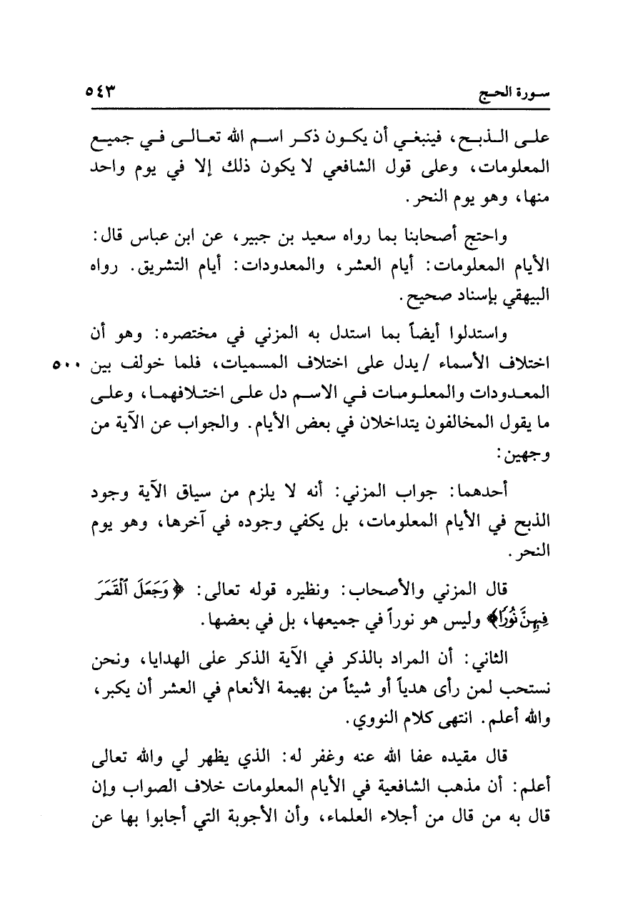 أحدهما: جواب المزني: أنه لا يلزم من سياق الآية وجود الذبح في الأيام المعلومات، بل يكفي وجوده في آخرها، وهو يوم النحر.