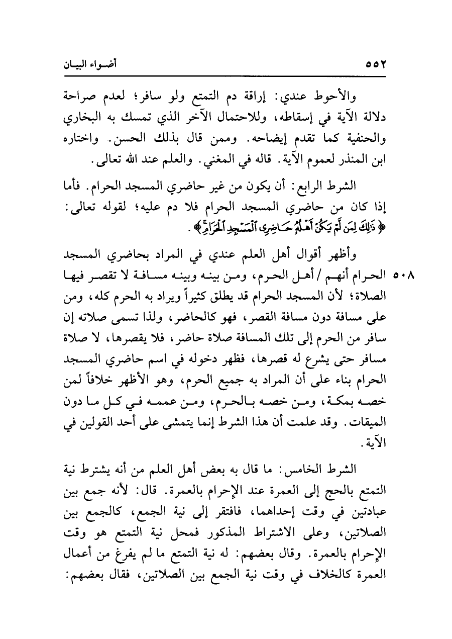 وأظهر أقوال أهل العلم عندي في المراد بحاضري المسجد الحرام أنهم أهل الحرم، ومن بينه وبينه مسافة لا تقصر فيها الصلاة؛ لأن المسجد الحرام قد يطلق كثيرًا ويراد به الحرم كله، ومن على مسافة دون مسافة القصر، فهو كالحاضر، ولذا تسمى صلاته إن سافر من الحرم إلى تلك المسافة صلاة حاضر، فلا يقصرها، لا صلاة مسافر حتى يشرع له قصرها، فظهر دخوله في اسم حاضري المسجد الحرام بناء على أن المراد به جميع الحرم، وهو الأظهر خلافًا لمن خصه بمكة، ومن خصه بالحرم، ومن عممه في كل ما دون الميقات. وقد علمت أن هذا الشرط إنما يتمشى على أحد القولين في الآية.