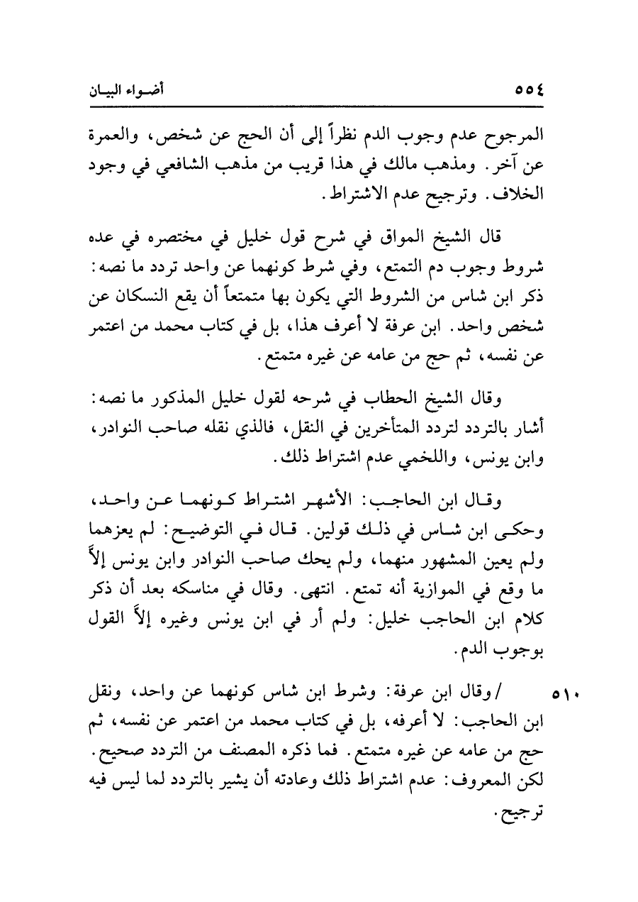 قال الشيخ المواق في شرح قول خليل في مختصره في عده شروط وجوب دم التمتع، وفي شرط كونهما عن واحد تردد ما نصه: ذكر ابن شاس من الشروط التي يكون بها متمتعًا أن يقع النسكان عن شخص واحد. ابن عرفة لا أعرف هذا، بل في كتاب محمد من اعتمر عن نفسه، ثم حج من عامه عن غيره متمتع.