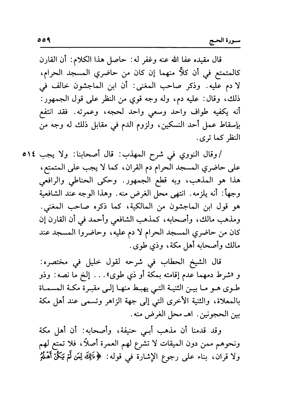 وقال النووي في شرح المهذب: قال أصحابنا: ولا يجب على حاضري المسجد الحرام دم القران، كما لا يجب على المتمتع، هذا هو المذهب، وبه قطع الجمهور. وحكى الحناطي والرافعي وجهًا: أنه يلزمه. انتهى محل الغرض منه. وهذا الوجه عند الشافعية هو قول ابن الماجشون من المالكية، كما ذكره صاحب المغني. ومذهب مالك، وأصحابه، كمذهب الشافعي وأحمد في أن القارن إن كان من حاضري المسجد الحرام لا دم عليه، وحاضروا المسجد عند مالك وأصحابه أهل مكة، وذي طوى.