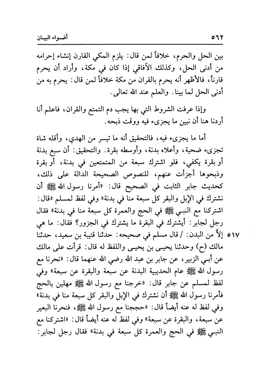 أما ما يجزئ فيه، فالتحقيق أنه ما تيسر من الهدي، وأقله شاة تجزئ ضحية، وأعلاه بدنة، وأوسطه بقرة. والتحقيق: أن سبع بدنة أو بقرة يكفي، فلو اشترك سبعة من المتمتعين في بدنة، أو بقرة وذبحوها أجزأت عنهم، للنصوص الصحيحة الدالة على ذلك، كحديث جابر الثابت في الصحيح قال: "أمرنا رسول الله - صلى الله عليه وسلم - أن نشترك في الإِبل والبقر كل سبعة منا في بدنة" وفي لفظ لمسلم "قال: اشتركنا مع النبي - صلى الله عليه وسلم - في الحج والعمرة كل سبعة منا في بدنة" فقال رجل لجابر: أيشترك في البقرة ما يشترك في الجزور؟ فقال: ما هي إلَّا من البدن: قال مسلم في صحيحه: حدثنا قتيبة بن سعيد، حدثنا مالك (ح) وحدثنا يحيى بن يحيى واللفظ له قال: قرأت على مالك عن أبي الزبير، عن جابر بن عبد الله رضي الله عنهما قال: "نحرنا مع رسول الله - صلى الله عليه وسلم - عام الحديبية البدنة عن سبعة والبقرة عن سبعة" وفي لفظ لمسلم عن جابر قال: "خرجنا مع رسول الله - صلى الله عليه وسلم - مهلين بالحج فأمرنا رسول الله - صلى الله عليه وسلم - أن نشترك في الإِبل والبقر كل سبعة منا في بدنة" وفي لفظ له عنه أيضًا قال: "حججنا مع رسول الله - صلى الله عليه وسلم - ، فنحرنا البعير عن سبعة، والبقرة عن سبعة" وفي لفظ له عنه أيضًا قال: "اشتركنا مع النبي - صلى الله عليه وسلم - في الحج والعمرة كل سبعة في بدنة" فقال رجل لجابر: