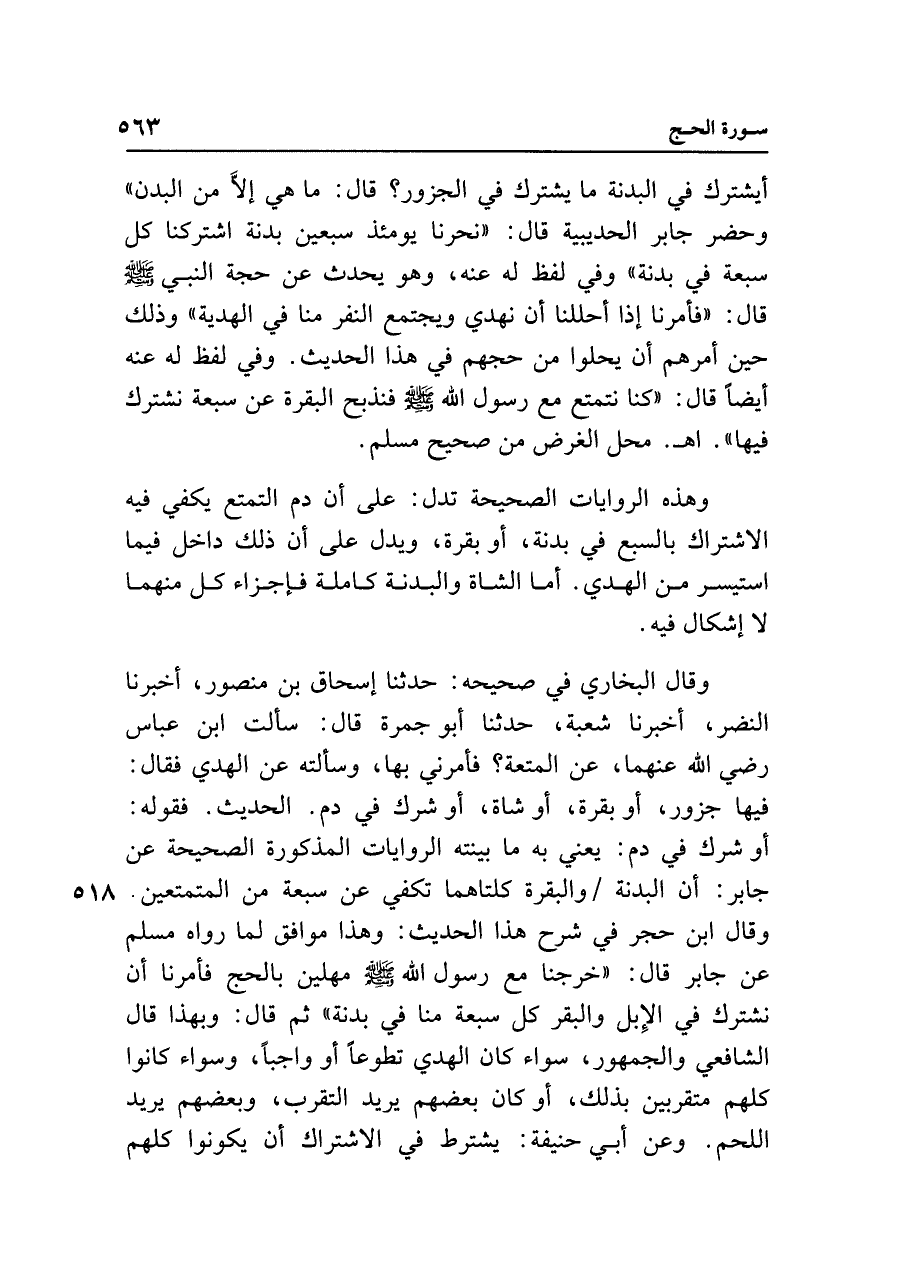 وقال البخاري في صحيحه: حدثنا إسحاق بن منصور، أخبرنا النضر، أخبرنا شعبة، حدثنا أبو جمرة قال: سألت ابن عباس رضي الله عنهما، عن المتعة؟ فأمرني بها، وسألته عن الهدي فقال: فيها جزور، أو بقرة، أو شاة، أو شرك في دم. الحديث. فقوله: أو شرك في دم: يعني به ما بينته الروايات المذكورة الصحيحة عن جابر: أن البدنة والبقرة كلتاهما تكفي عن سبعة من المتمتعين. وقال ابن حجر في شرح هذا الحديث: وهذا موافق لما رواه مسلم عن جابر قال: "خرجنا مع رسول الله - صلى الله عليه وسلم - مهلين بالحج فأمرنا أن نشترك في الإِبل والبقر كل سبعة منا في بدنة" ثم قال: وبهذا قال الشافعي والجمهور، سواء كان الهدي تطوعًا أو واجبًا، وسواء كانوا كلهم متقربين بذلك، أو كان بعضهم يريد التقرب، وبعضهم يريد اللحم. وعن أبي حنيفة: يشترط في الاشتراك أن يكونوا كلهم
