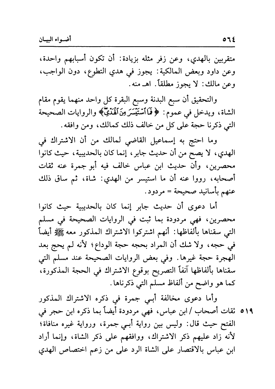وما احتج به إسماعيل القاضي لمالك من أن الاشتراك في الهدي، لا يصح من أن حديث جابر، إنما كان بالحديبية، حيث كانوا محصرين، وأن حديث ابن عباس خالف فيه أبو جمرة عنه ثقات أصحابه، رووا عنه أن ما استيسر من الهدي: شاة، ثم ساق ذلك عنهم بأسانيد صحيحة = مردود.