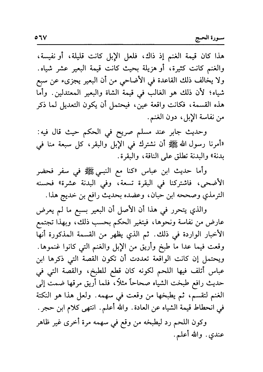 والذي يتحرر في هذا أن الأصل أن البعير بسبع ما لم يعرض عارض من نفاسة ونحوها، فيتغير الحكم بحسب ذلك، وبهذا تجتمع الأخبار الواردة في ذلك. ثم الذي يظهر من القسمة المذكورة أنها وقعت فيما عدا ما طبخ وأريق من الإِبل والغنم التي كانوا غنموها. ويحتمل إن كانت الواقعة تعددت أن تكون القصة التي ذكرها ابن عباس أتلف فيها اللحم لكونه كان قطع للطبخ، والقصة التي في حديث رافع طبخت الشياه صحاحًا مثلًا، فلما أريق مرقها ضمت إلى الغنم لتقسم، ثم يطبخها من وقعت في سهمه. ولعل هذا هو النكتة في انحطاط قيمة الشياه عن العادة. واللَّه أعلم. انتهى كلام ابن حجر.
