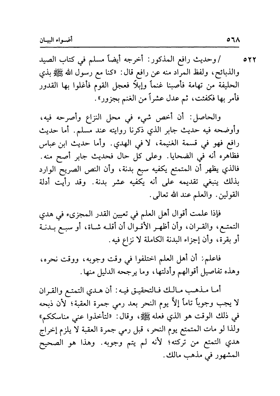 والحاصل: أن أخص شيء في محل النزاع وأصرحه فيه، وأوضحه فيه حديث جابر الذي ذكرنا روايته عند مسلم. أما حديث رافع فهو في قسمة الغنيمة، لا في الهدي. وأما حديث ابن عباس فظاهره أنه في الضحايا. وعلى كل حال فحديث جابر أصح منه. فالذي يظهر أن المتمتع يكفيه سبع بدنة، وأن النص الصريح الوارد بذلك ينبغي تقديمه على أنه يكفيه عشر بدنة. وقد رأيت أدلة القولين. والعلم عند الله تعالى.