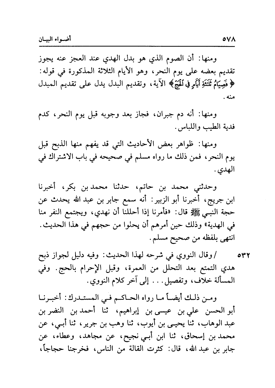 وحدثني محمد بن حاتم، حدثنا محمد بن بكر، أخبرنا ابن جريج، أخبرنا أبو الزبير: أنه سمع جابر بن عبد الله يحدث عن حجة النبي - صلى الله عليه وسلم - قال: "فأمرنا إذا أحللنا أن نهدي، ويجتمع النفر منا في الهدية" وذلك حين أمرهم أن يحلوا من حجهم في هذا الحديث. انتهى بلفظه من صحيح مسلم.