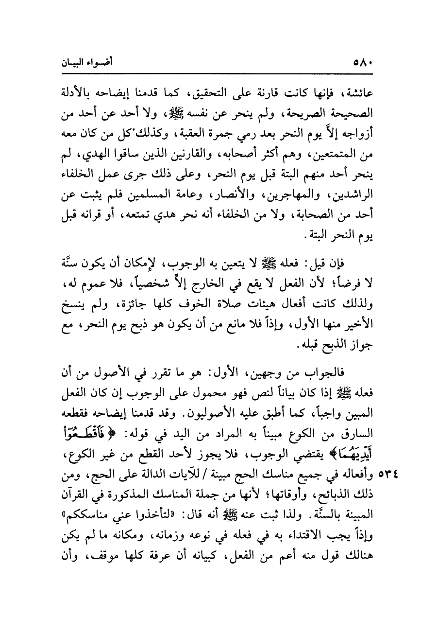 فالجواب من وجهين، الأول: هو ما تقرر في الأصول من أن فعله - صلى الله عليه وسلم - إذا كان بيانًا لنص فهو محمول على الوجوب إن كان الفعل المبين واجبًا، كما أطبق عليه الأصوليون. وقد قدمنا إيضاحه فقطعه السارق من الكوع مبينًا به المراد من اليد في قوله: {فَاقْطَعُوَا أَيْدِيَهُمَا} يقتضي الوجوب، فلا يجوز لأحد القطع من غير الكوع، وأفعاله في جميع مناسك الحج مبينة للآيات الدالة على الحج، ومن ذلك الذبائح، وأوقاتها؛ لأنها من جملة المناسك المذكورة في القرآن المبينة بالسنَّة. ولذا ثبت عنه - صلى الله عليه وسلم - أنه قال: "لتأخذوا عني مناسككم" وإذًا يجب الاقتداء به في فعله في نوعه وزمانه، ومكانه ما لم يكن هنالك قول منه أعم من الفعل، كبيانه أن عرفة كلها موقف، وأن