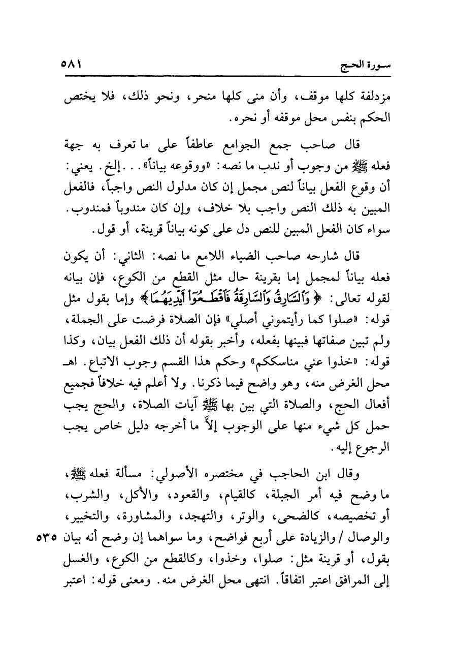 قال شارحه صاحب الضياء اللامع ما نصه: الثاني: أن يكون فعله بيانًا لمجمل إما بقرينة حال مثل القطع من الكوع، فإن بيانه لقوله تعالى: {وَالسَّارِقُ وَالسَّارِقَةُ فَاقْطَعُوا أَيْدِيَهُمَا} وإما بقول مثل قوله: "صلوا كما رأيتموني أصلي" فإن الصلاة فرضت على الجملة، ولم تبين صفاتها فبينها بفعله، وأخبر بقوله أن ذلك الفعل بيان، وكذا قوله: "خذوا عني مناسككم" وحكم هذا القسم وجوب الاتباع. اهـ محل الغرض منه، وهو واضح فيما ذكرنا. ولا أعلم فيه خلافًا فجميع أفعال الحج، والصلاة التي بين بها - صلى الله عليه وسلم - آيات الصلاة، والحج يجب حمل كل شيء منها على الوجوب إلَّا ما أخرجه دليل خاص يجب الرجوع إليه.