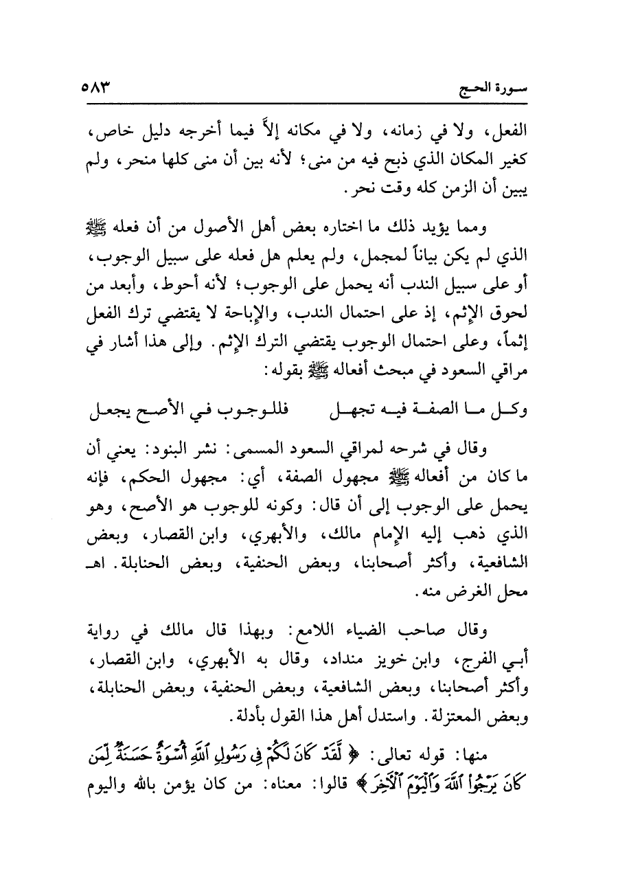 وقال في شرحه لمراقي السعود المسمى: نشر البنود: يعني أن ما كان من أفعاله - صلى الله عليه وسلم - مجهول الصفة، أي: مجهول الحكم، فإنه يحمل على الوجوب إلى أن قال: وكونه للوجوب هو الأصح، وهو الذي ذهب إليه الإِمام مالك، والأبهري، وابن القصار، وبعض الشافعية، وأكثر أصحابنا، وبعض الحنفية، وبعض الحنابلة. اهـ محل الغرض منه.