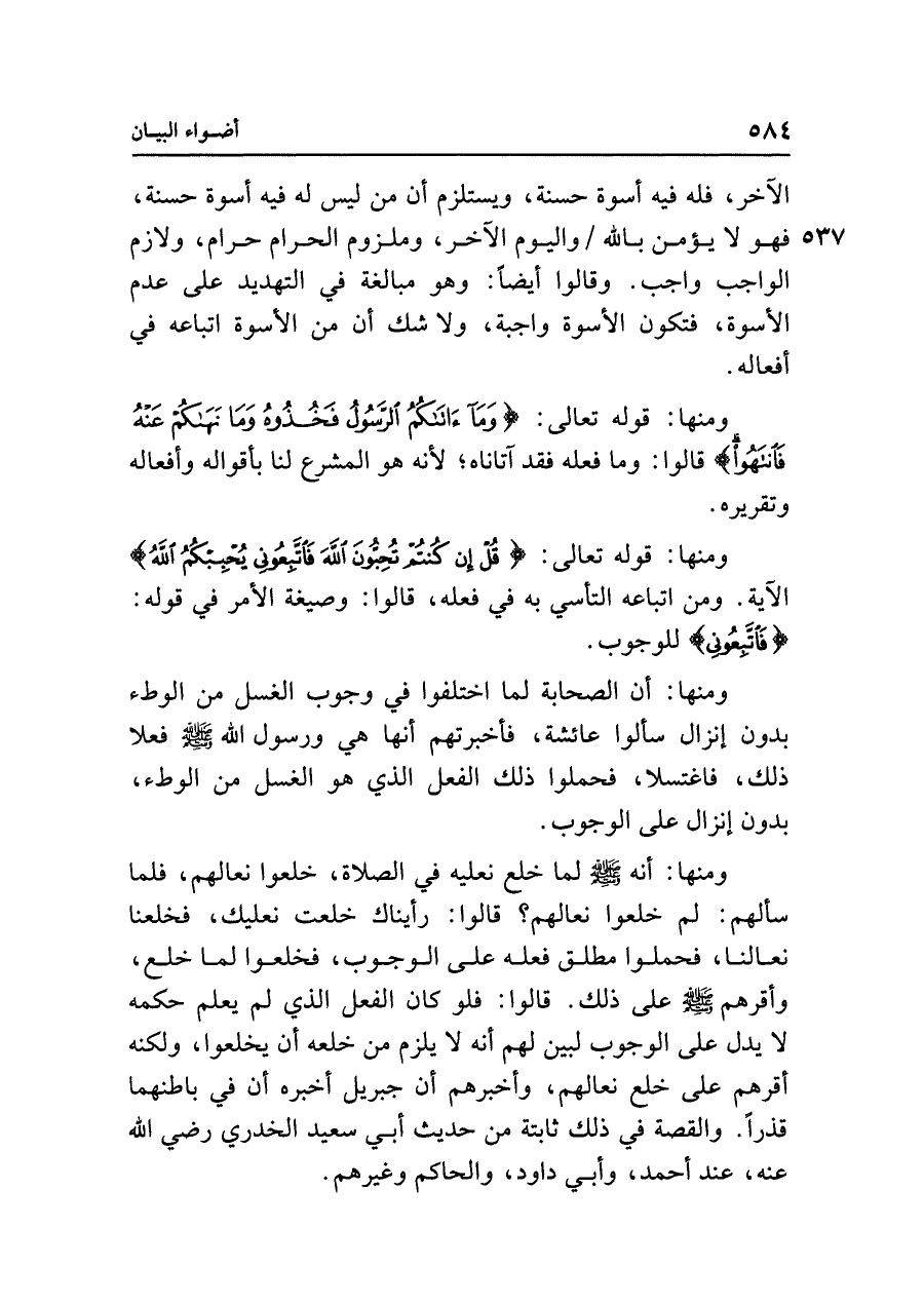ومنها: أنه - صلى الله عليه وسلم - لما خلع نعليه في الصلاة، خلعوا نعالهم، فلما سألهم: لم خلعوا نعالهم؟ قالوا: رأيناك خلعت نعليك، فخلعنا نعالنا، فحملوا مطلق فعله على الوجوب، فخلعوا لما خلع، وأقرهم - صلى الله عليه وسلم - على ذلك. قالوا: فلو كان الفعل الذي لم يعلم حكمه لا يدل على الوجوب لبين لهم أنه لا يلزم من خلعه أن يخلعوا، ولكنه أقرهم على خلع نعالهم، وأخبرهم أن جبريل أخبره أن في باطنهما قذرًا. والقصة في ذلك ثابتة من حديث أبي سعيد الخدري رضي الله عنه، عند أحمد، وأبي داود، والحاكم وغيرهم.