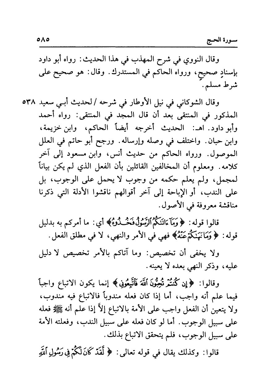 وقال الشوكاني في نيل الأوطار في شرحه لحديث أبي سعيد المذكور في المنتقى بعد أن قال المجد في المنتقى: رواه أحمد وأبو داود. اهـ: الحديث أخرجه أيضًا الحاكم، وابن خزيمة، وابن حبان. واختلف في وصله وإرساله. ورجح أبو حاتم في العلل الموصول. ورواه الحاكم من حديث أنس، وابن مسعود إلى آخر كلامه. ومعلوم أن المخالفين القائلين بأن الفعل الذي لم يكن بيانًا لمجمل، ولم يعلم حكمه من وجوب لا يحمل على الوجوب، بل على الندب، أو الإِباحة إلى آخر أقوالهم ناقشوا الأدلة التي ذكرنا مناقشة معروفة في الأصول.