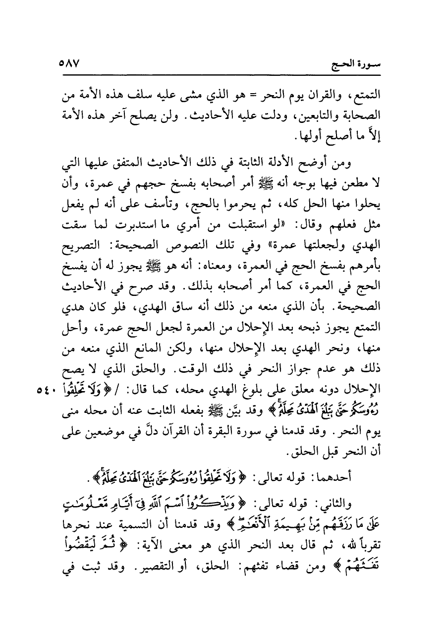 ومن أوضح الأدلة الثابتة في ذلك الأحاديث المتفق عليها التي لا مطعن فيها بوجه أنه - صلى الله عليه وسلم - أمر أصحابه بفسخ حجهم في عمرة، وأن يحلوا منها الحل كله، ثم يحرموا بالحج، وتأسف على أنه لم يفعل مثل فعلهم وقال: "لو استقبلت من أمري ما استدبرت لما سقت الهدي ولجعلتها عمرة" وفي تلك النصوص الصحيحة: التصريح بأمرهم بفسخ الحج في العمرة، ومعناه: أنه هو - صلى الله عليه وسلم - يجوز له أن يفسخ الحج في العمرة، كما أمر أصحابه بذلك. وقد صرح في الأحاديث الصحيحة. بأن الذي منعه من ذلك أنه ساق الهدي، فلو كان هدي التمتع يجوز ذبحه بعد الإِحلال من العمرة لجعل الحج عمرة، وأحل منها، ونحر الهدي بعد الإِحلال منها، ولكن المانع الذي منعه من ذلك هو عدم جواز النحر في ذلك الوقت. والحلق الذي لا يصح الإِحلال دونه معلق على بلوغ الهدي محله، كما قال: {وَلَا تَحْلِقُوا رُءُوسَكُمْ حَتَّى يَبْلُغَ الْهَدْيُ مَحِلَّهُ} وقد بيَّن - صلى الله عليه وسلم - بفعله الثابت عنه أن محله منى يوم النحر. وقد قدمنا في سورة البقرة أن القرآن دلَّ في موضعين على أن النحر قبل الحلق.