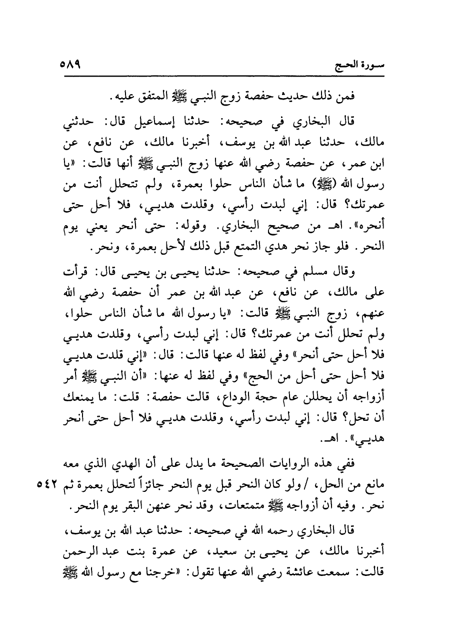 وقال مسلم في صحيحه: حدثنا يحيى بن يحيى قال: قرأت على مالك، عن نافع، عن عبد الله بن عمر أن حفصة رضي الله عنهم، زوج النبي - صلى الله عليه وسلم - قالت: "يا رسول الله ما شأن الناس حلوا، ولم تحلل أنت من عمرتك؟ قال: إني لبدت رأسي، وقلدت هديي فلا أحل حتى أنحر" وفي لفظ له عنها قالت: قال: "إني قلدت هديي فلا أحل حتى أحل من الحج" وفي لفظ له عنها: "أن النبي - صلى الله عليه وسلم - أمر أزواجه أن يحللن عام حجة الوداع، قالت حفصة: قلت: ما يمنعك أن تحل؟ قال: إني لبدت رأسي، وقلدت هديي فلا أحل حتى أنحر هديي". اهـ.