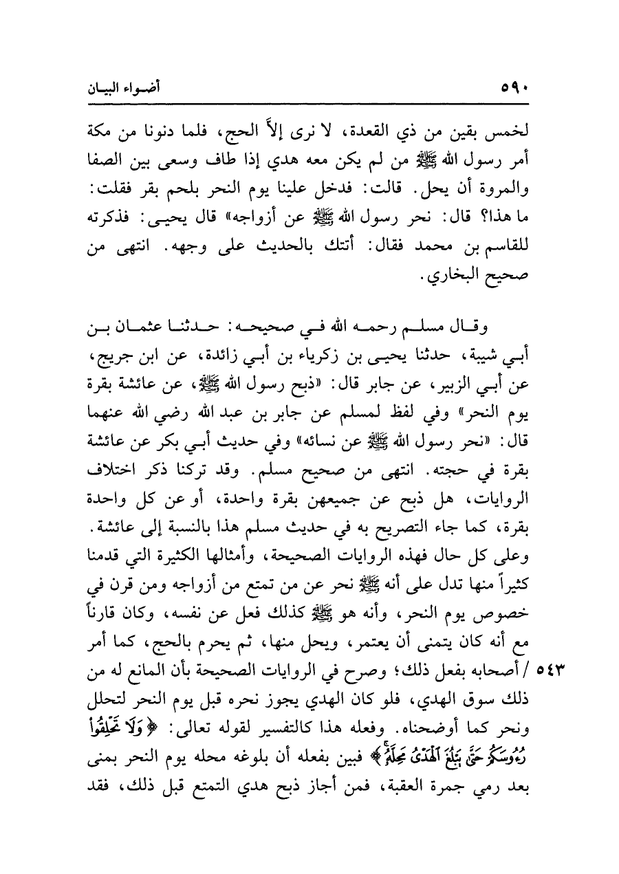 وقال مسلم رحمه الله في صحيحه: حدثنا عثمان بن أبي شيبة، حدثنا يحيى بن زكرياء بن أبي زائدة، عن ابن جريج، عن أبي الزبير، عن جابر قال: "ذبح رسول الله - صلى الله عليه وسلم - ، عن عائشة بقرة يوم النحر" وفي لفظ لمسلم عن جابر بن عبد الله رضي الله عنهما قال: "نحر رسول الله - صلى الله عليه وسلم - عن نسائه" وفي حديث أبي بكر عن عائشة بقرة في حجته. انتهى من صحيح مسلم. وقد تركنا ذكر اختلاف الروايات، هل ذبح عن جميعهن بقرة واحدة، أو عن كل واحدة بقرة، كما جاء التصريح به في حديث مسلم هذا بالنسبة إلى عائشة. وعلى كل حال فهذه الروايات الصحيحة، وأمثالها الكثيرة التي قدمنا كثيرًا منها تدل على أنه - صلى الله عليه وسلم - نحر عن من تمتع من أزواجه ومن قرن في خصوص يوم النحر، وأنه هو - صلى الله عليه وسلم - كذلك فعل عن نفسه، وكان قارنًا مع أنه كان يتمنى أن يعتمر، ويحل منها، ثم يحرم بالحج، كما أمر أصحابه بفعل ذلك؛ وصرح في الروايات الصحيحة بأن المانع له من ذلك سوق الهدي، فلو كان الهدي يجوز نحره قبل يوم النحر لتحلل ونحر كما أوضحناه. وفعله هذا كالتفسير لقوله تعالى: {وَلَا تَحْلِقُوا رُءُوسَكُمْ حَتَّى يَبْلُغَ الْهَدْيُ مَحِلَّهُ} فبين بفعله أن بلوغه محله يوم النحر بمنى بعد رمي جمرة العقبة، فمن أجاز ذبح هدي التمتع قبل ذلك، فقد