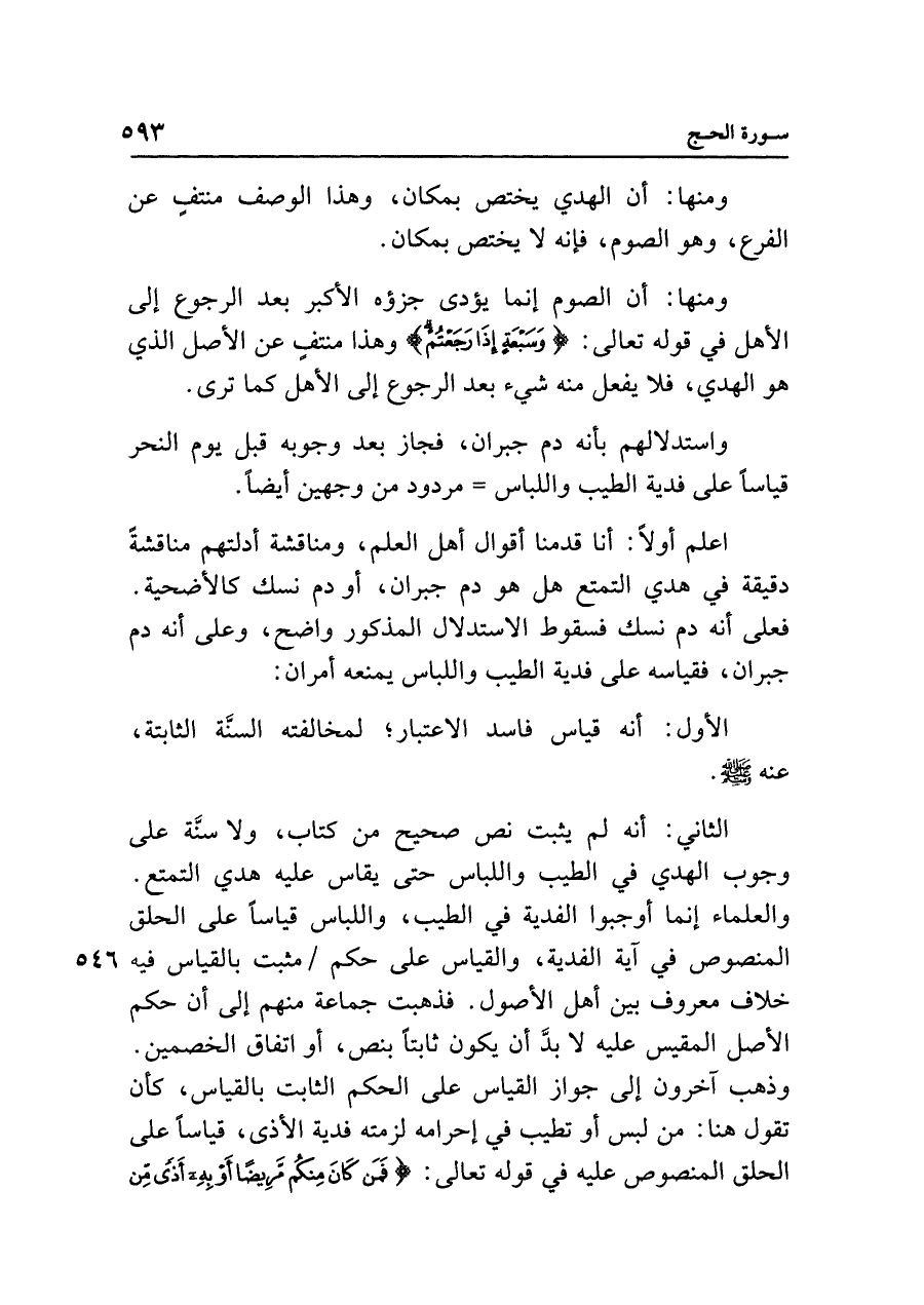 الثاني: أنه لم يثبت نص صحيح من كتاب، ولا سنَّة على وجوب الهدي في الطيب واللباس حتى يقاس عليه هدي التمتع. والعلماء إنما أوجبوا الفدية في الطيب، واللباس قياسًا على الحلق المنصوص في آية الفدية، والقياس على حكم مثبت بالقياس فيه خلاف معروف بين أهل الأصول. فذهبت جماعة منهم إلى أن حكم الأصل المقيس عليه لا بدَّ أن يكون ثابتًا بنص، أو اتفاق الخصمين. وذهب آخرون إلى جواز القياس على الحكم الثابت بالقياس، كأن تقول هنا: من لبس أو تطيب في إحرامه لزمته فدية الأذى، قياسًا على الحلق المنصوص عليه في قوله تعالى: {فَمَنْ كَانَ مِنْكُمْ مَرِيضًا أَوْ بِهِ أَذًى مِنْ