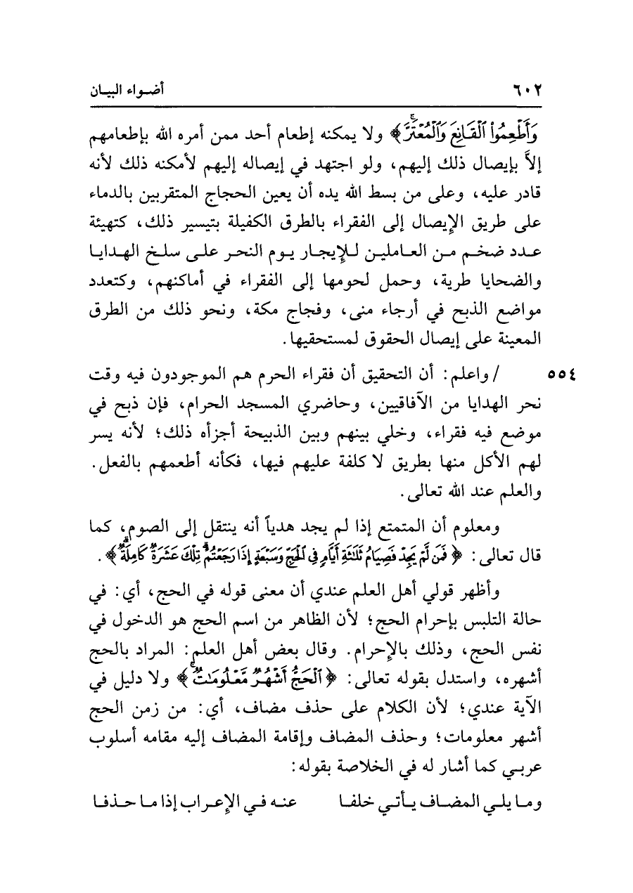 وَأَطْعِمُوا الْبَائِسَ الْفَقِيرَ} ولا يمكنه إطعام أحد ممن أمره الله بإطعامهم إلَّا بإيصال ذلك إليهم، ولو اجتهد في إيصاله إليهم لأمكنه ذلك لأنه قادر عليه، وعلى من بسط الله يده أن يعين الحجاج المتقربين بالدماء على طريق الإِيصال إلى الفقراء بالطرق الكفيلة بتيسير ذلك، كتهيئة عدد ضخم من العاملين للإِيجار يوم النحر على سلخ الهدايا والضحايا طرية، وحمل لحومها إلى الفقراء في أماكنهم، وكتعدد مواضع الذبح في أرجاء منى، وفجاج مكة، ونحو ذلك من الطرق المعينة على إيصال الحقوق لمستحقيها.