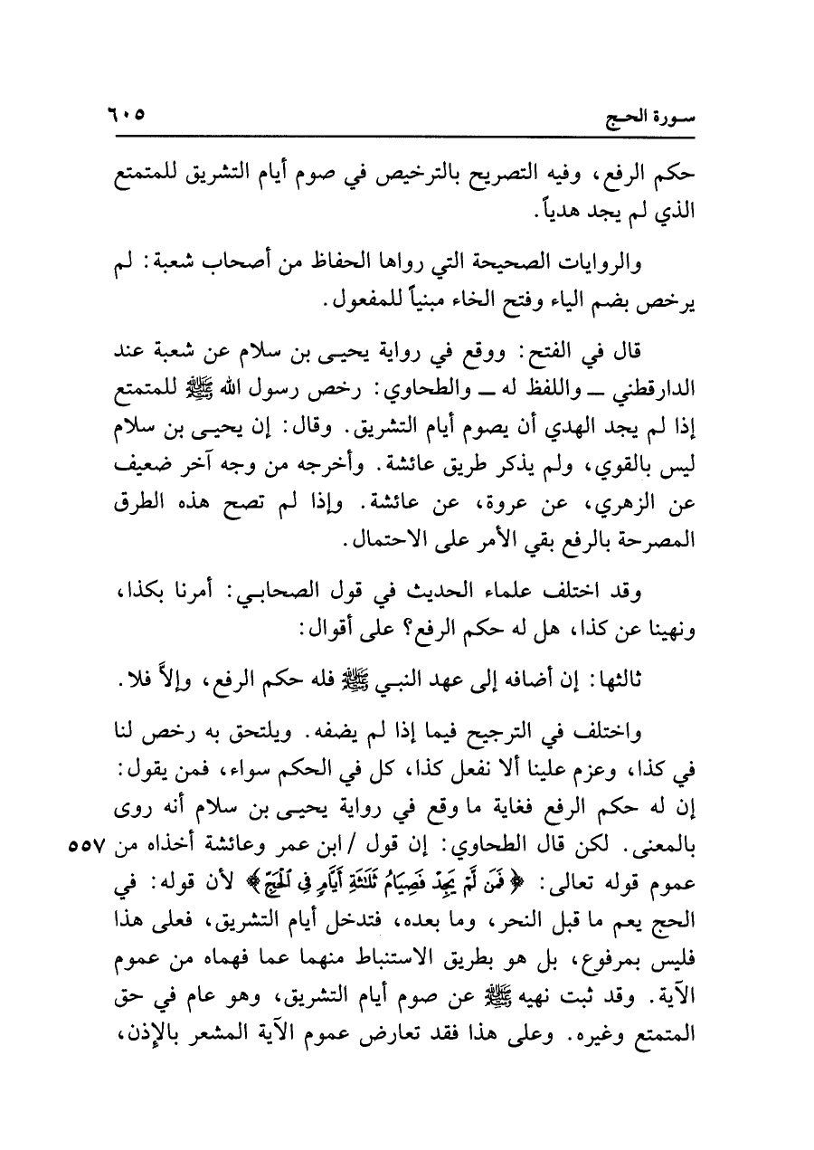 واختلف في الترجيح فيما إذا لم يضفه. ويلتحق به رخص لنا في كذا، وعزم علينا ألا نفعل كذا، كل في الحكم سواء، فمن يقول: إن له حكم الرفع فغاية ما وقع في رواية يحيى بن سلام أنه روى بالمعنى. لكن قال الطحاوي: إن قول ابن عمر وعائشة أخذاه من عموم قوله تعالى: {فَمَنْ لَمْ يَجِدْ فَصِيَامُ ثَلَاثَةِ أَيَّامٍ فِي الْحَجِّ} لأن قوله: في الحج يعم ما قبل النحر، وما بعده، فتدخل أيام التشريق، فعلى هذا فليس بمرفوع، بل هو بطريق الاستنباط منهما عما فهماه من عموم الآية. وقد ثبت نهيه - صلى الله عليه وسلم - عن صوم أيام التشريق، وهو عام في حق المتمتع وغيره. وعلى هذا فقد تعارض عموم الآية المشعر بالإِذن،