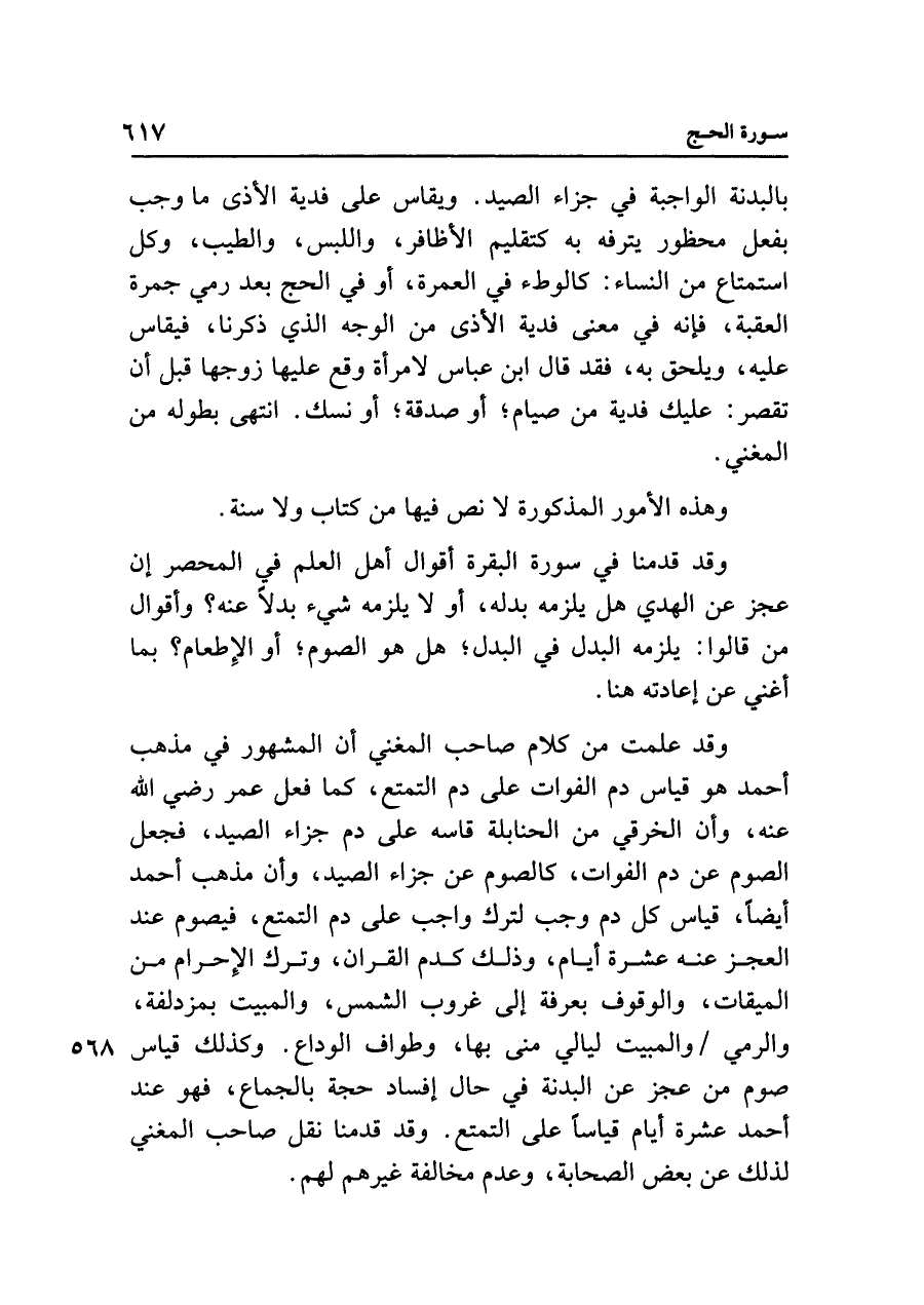 بالبدنة الواجبة في جزاء الصيد. ويقاس على فدية الأذى ما وجب بفعل محظور يترفه به كتقليم الأظافر، واللبس، والطيب، وكل استمتاع من النساء: كالوطء في العمرة، أو في الحج بعد رمي جمرة العقبة، فإنه في معنى فدية الأذى من الوجه الذي ذكرنا، فيقاس عليه، ويلحق به، فقد قال ابن عباس لامرأة وقع عليها زوجها قبل أن تقصر: عليك فدية من صيام؛ أو صدقة؛ أو نسك. انتهى بطوله من المغني.