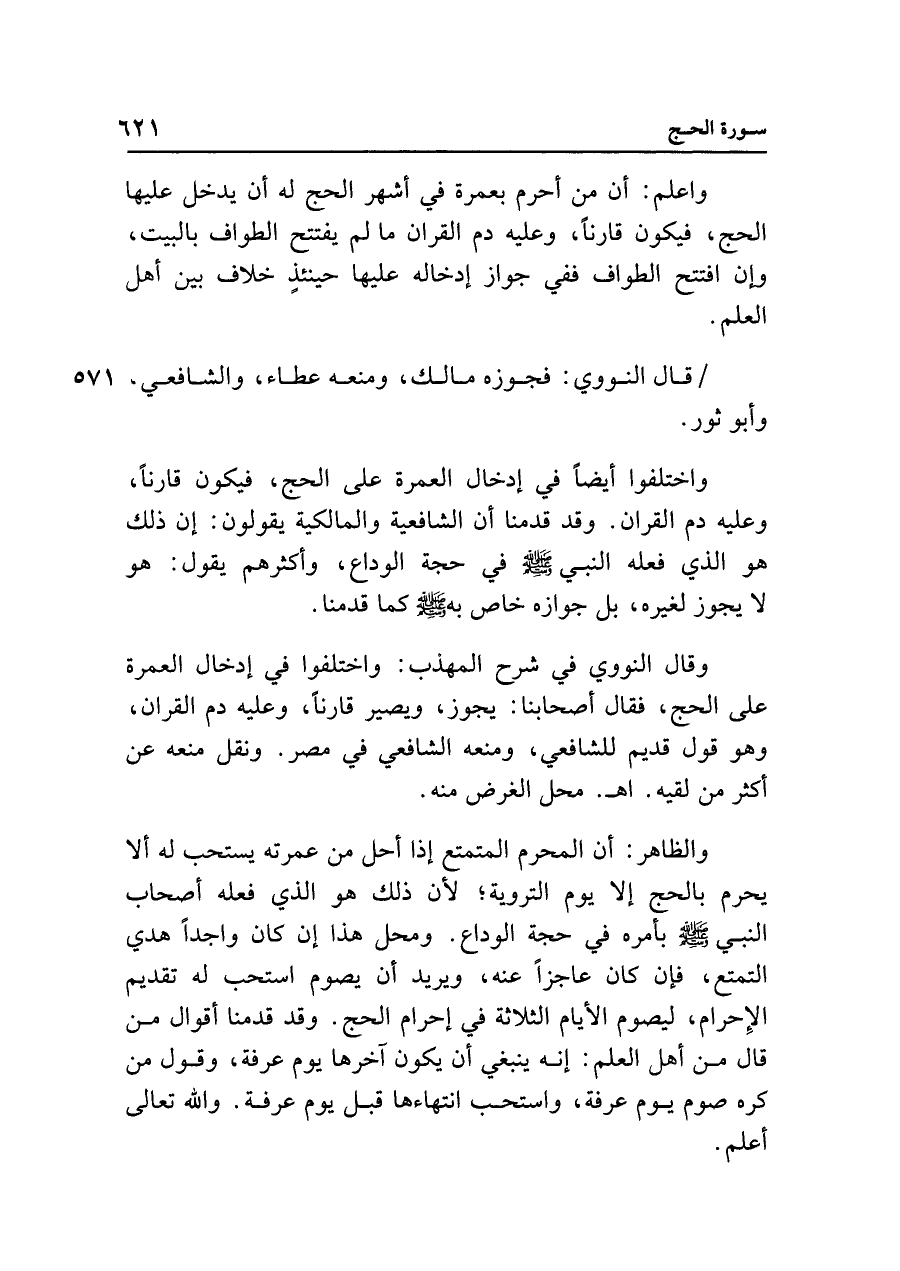واختلفوا أيضًا في إدخال العمرة على الحج، فيكون قارنًا، وعليه دم القران. وقد قدمنا أن الشافعية والمالكية يقولون: إن ذلك هو الذي فعله النبي - صلى الله عليه وسلم - في حجة الوداع، وأكثرهم يقول: هو لا يجوز لغيره، بل جوازه خاص به - صلى الله عليه وسلم - كما قدمنا.