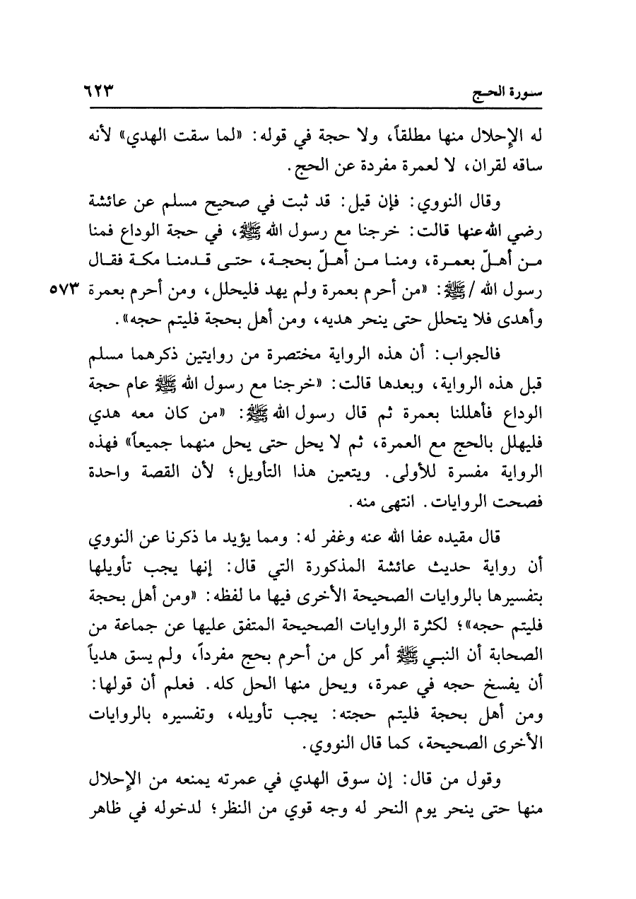 قال مقيده عفا الله عنه وغفر له: ومما يؤيد ما ذكرنا عن النووي أن رواية حديث عائشة المذكورة التي قال: إنها يجب تأويلها بتفسيرها بالروايات الصحيحة الأخرى فيها ما لفظه: "ومن أهل بحجة فليتم حجه"؛ لكثرة الروايات الصحيحة المتفق عليها عن جماعة من الصحابة أن النبي - صلى الله عليه وسلم - أمر كل من أحرم بحج مفردًا، ولم يسق هديًا أن يفسخ حجه في عمرة، ويحل منها الحل كله. فعلم أن قولها: ومن أهل بحجة فليتم حجته: يجب تأويله، وتفسيره بالروايات الأخرى الصحيحة، كما قال النووي.