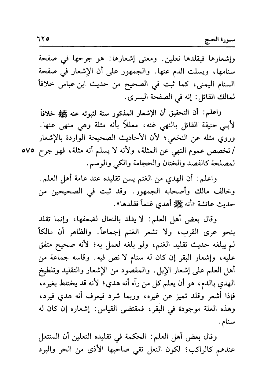 واعلم: أن التحقيق أن الإِشعار المذكور سنة لثبوته - صلى الله عليه وسلم - خلافًا لأبي حنيفة القائل بالنهي عنه، معللًا بأنه مثلة وهي منهى عنها. وروي مثله عن النخعي، لأن الأحاديث الصحيحة الواردة بالإِشعار تخصص عموم النهي عن المثلة، ولأنه لا يسلم أنه مثلة، فهو جرح لمصلحة كالفصد والختان والحجامة والكي والوسم.