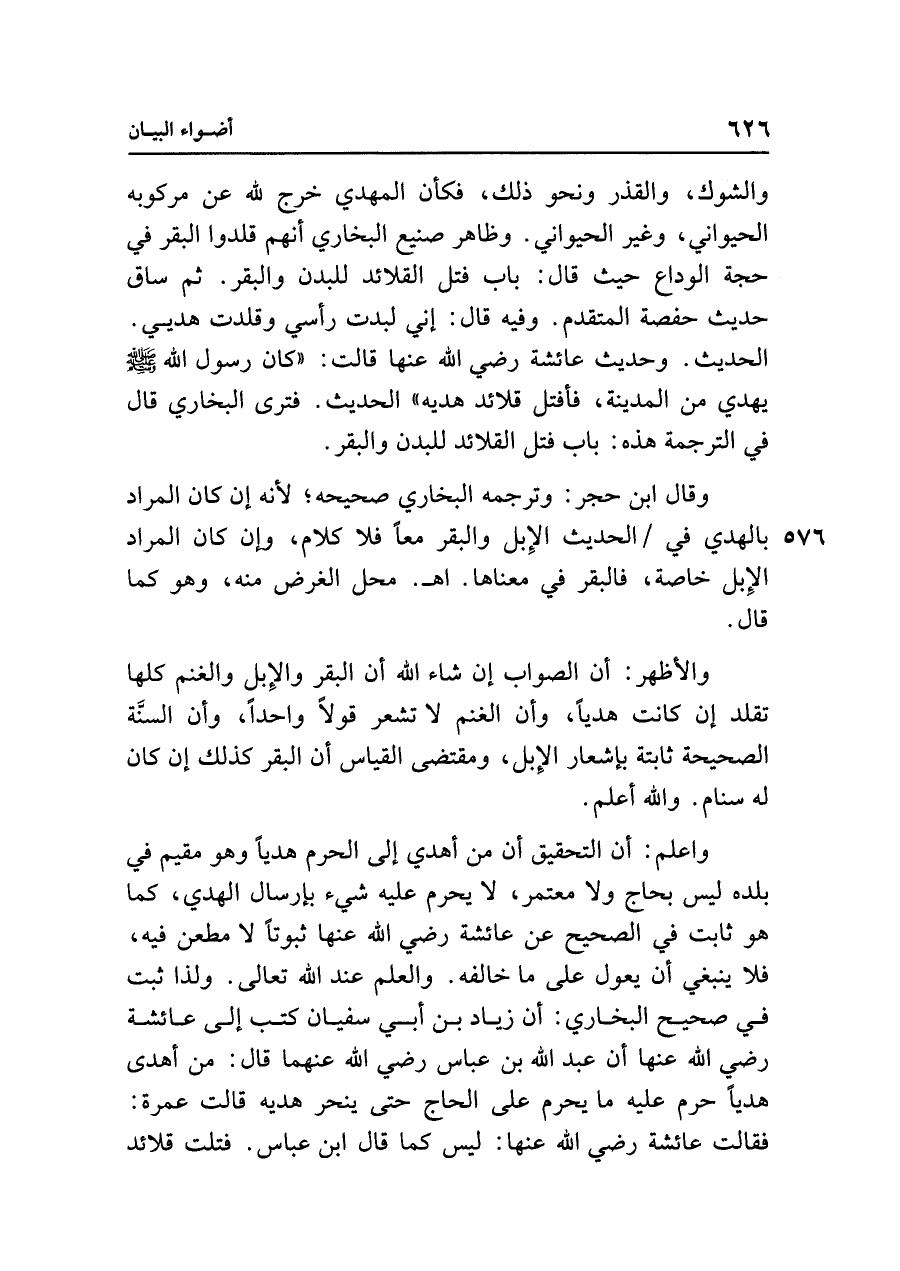 والأظهر: أن الصواب إن شاء الله أن البقر والإِبل والغنم كلها تقلد إن كانت هديًا، وأن الغنم لا تشعر قولًا واحدًا، وأن السنَّة الصحيحة ثابتة بإشعار الإِبل، ومقتضى القياس أن البقر كذلك إن كان له سنام. واللَّه أعلم.