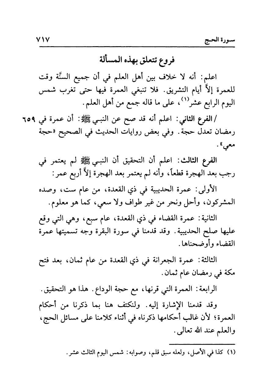 الفرع الثالث: اعلم أن التحقيق أن النبي - صلى الله عليه وسلم - لم يعتمر في رجب بعد الهجرة قطعًا، وأنه لم يعتمر بعد الهجرة إلَّا أربع عمر:
