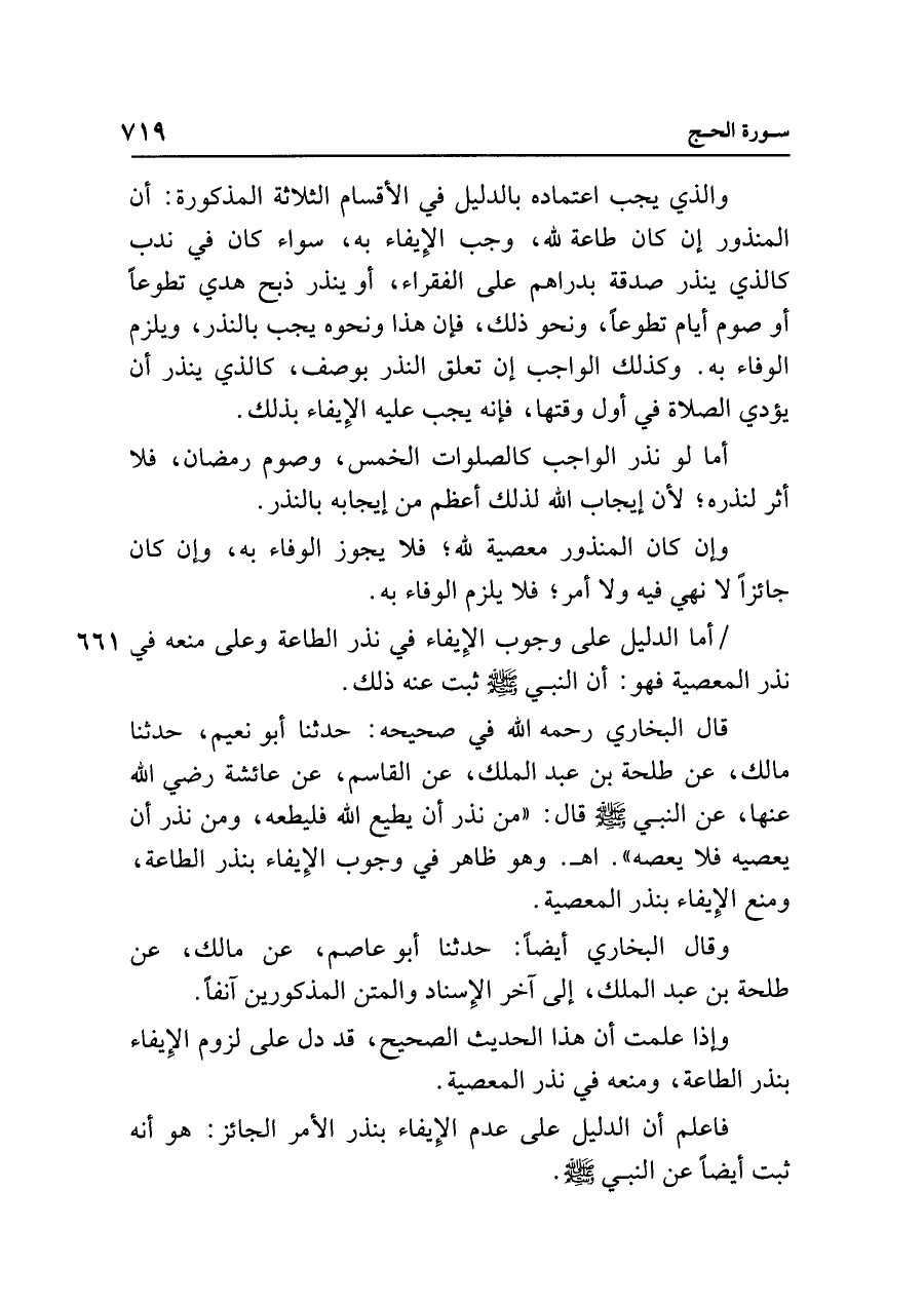قال البخاري رحمه الله في صحيحه: حدثنا أبو نعيم، حدثنا مالك، عن طلحة بن عبد الملك، عن القاسم، عن عائشة رضي الله عنها، عن النبي - صلى الله عليه وسلم - قال: "من نذر أن يطيع الله فليطعه، ومن نذر أن يعصيه فلا يعصه". اهـ. وهو ظاهر في وجوب الإِيفاء بنذر الطاعة، ومنع الإِيفاء بنذر المعصية.