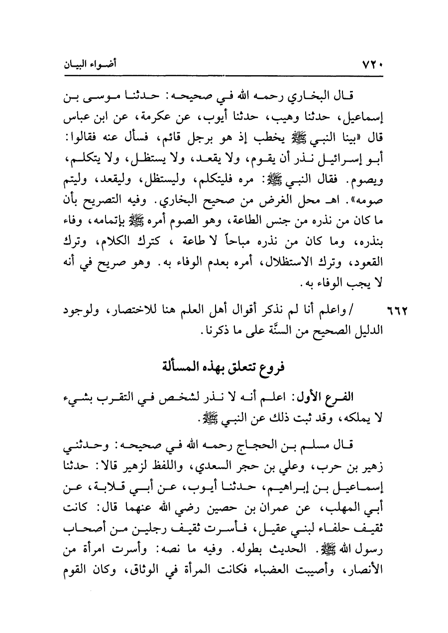 قال البخاري رحمه الله في صحيحه: حدثنا موسى بن إسماعيل، حدثنا وهيب، حدثنا أيوب، عن عكرمة، عن ابن عباس قال "بينا النبي - صلى الله عليه وسلم - يخطب إذ هو برجل قائم، فسأل عنه فقالوا: أبو إسرائيل نذر أن يقوم، ولا يقعد، ولا يستظل، ولا يتكلم، ويصوم. فقال النبي - صلى الله عليه وسلم - : مره فليتكلم، وليستظل، وليقعد، وليتم صومه". اهـ محل الغرض من صحيح البخاري. وفيه التصريح بأن ما كان من نذره من جنس الطاعة، وهو الصوم أمره - صلى الله عليه وسلم - بإتمامه، وفاء بنذره، وما كان من نذره مباحًا لا طاعة، كترك الكلام، وترك القعود، وترك الاستظلال، أمره بعدم الوفاء به. وهو صريح في أنه لا يجب الوفاء به.