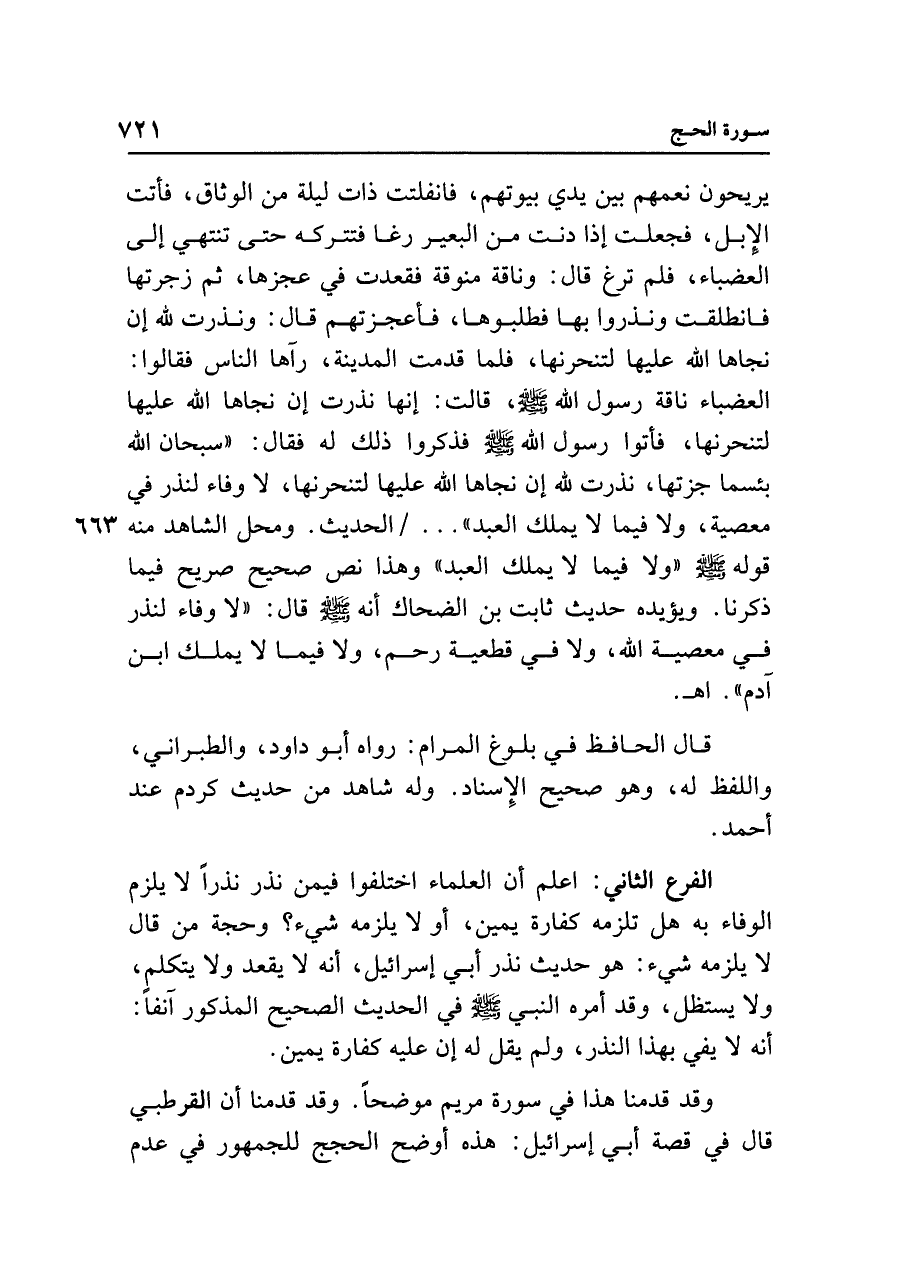 يريحون نعمهم بين يدي بيوتهم، فانفلتت ذات ليلة من الوثاق، فأتت الإِبل، فجعلت إذا دنت من البعير رغا فتتركه حتى تنتهي إلى العضباء، فلم ترغ قال: وناقة منوقة فقعدت في عجزها، ثم زجرتها فانطلقت ونذروا بها فطلبوها، فأعجزتهم قال: ونذرت للَّه إن نجاها الله عليها لتنحرنها، فلما قدمت المدينة، رآها الناس فقالوا: العضباء ناقة رسول الله - صلى الله عليه وسلم - ، قالت: إنها نذرت إن نجاها الله عليها لتنحرنها، فأتوا رسول الله - صلى الله عليه وسلم - فذكروا ذلك له فقال: "سبحان الله بئسما جزتها، نذرت للَّه إن نجاها الله عليها لتنحرنها، لا وفاء لنذر في معصية، ولا فيما لا يملك العبد". . . الحديث. ومحل الشاهد منه قوله - صلى الله عليه وسلم - "ولا فيما لا يملك العبد" وهذا نص صحيح صريح فيما ذكرنا. ويؤيده حديث ثابت بن الضحاك أنه - صلى الله عليه وسلم - قال: "لا وفاء لنذر في معصية الله، ولا في قطيعة رحم، ولا فيما لا يملك ابن آدم". اهـ.