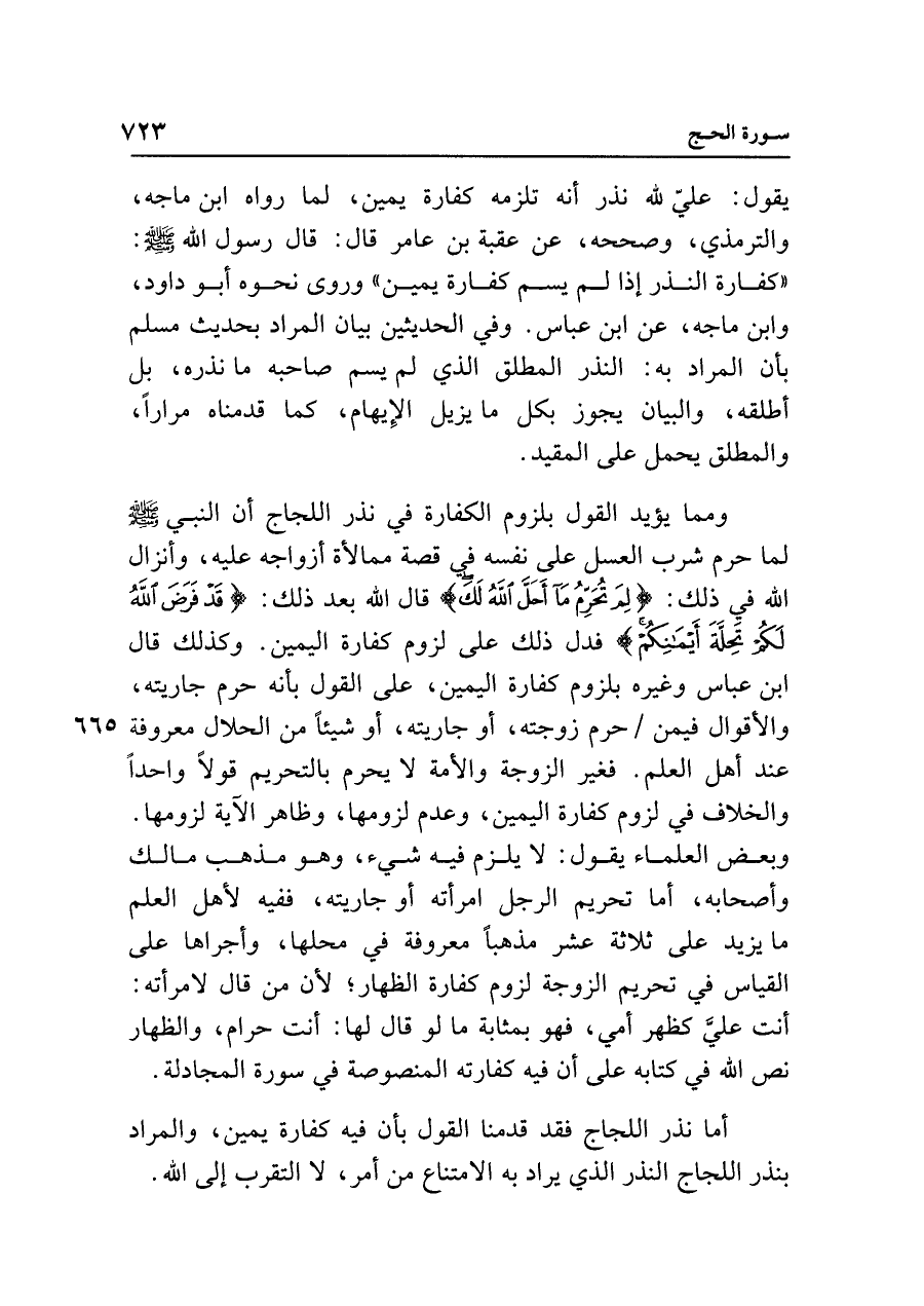 ومما يؤيد القول بلزوم الكفارة في نذر اللجاج أن النبي - صلى الله عليه وسلم - لما حرم شرب العسل على نفسه في قصة ممالأة أزواجه عليه، وأنزل الله في ذلك: {لِمَ تُحَرِّمُ مَا أَحَلَّ اللَّهُ لَكَ} قال الله بعد ذلك: {قَدْ فَرَضَ اللَّهُ لَكُمْ تَحِلَّةَ أَيْمَانِكُمْ} فدل ذلك على لزوم كفارة اليمين. وكذلك قال ابن عباس وغيره بلزوم كفارة اليمين، على القول بأنه حرم جاريته، والأقوال فيمن حرم زوجته، أو جاريته، أو شيئًا من الحلال معروفة عند أهل العلم. فغير الزوجة والأمة لا يحرم بالتحريم قولًا واحدًا والخلاف في لزوم كفارة اليمين، وعدم لزومها، وظاهر الآية لزومها. وبعض العلماء يقول: لا يلزم فيه شيء، وهو مذهب مالك وأصحابه، أما تحريم الرجل امرأته أو جاريته، ففيه لأهل العلم ما يزيد على ثلاثة عشر مذهبًا معروفة في محلها، وأجراها على القياس في تحريم الزوجة لزوم كفارة الظهار؛ لأن من قال لامرأته: أنت عليَّ كظهر أمي، فهو بمثابة ما لو قال لها: أنت حرام، والظهار نص الله في كتابه على أن فيه كفارته المنصوصة في سورة المجادلة.