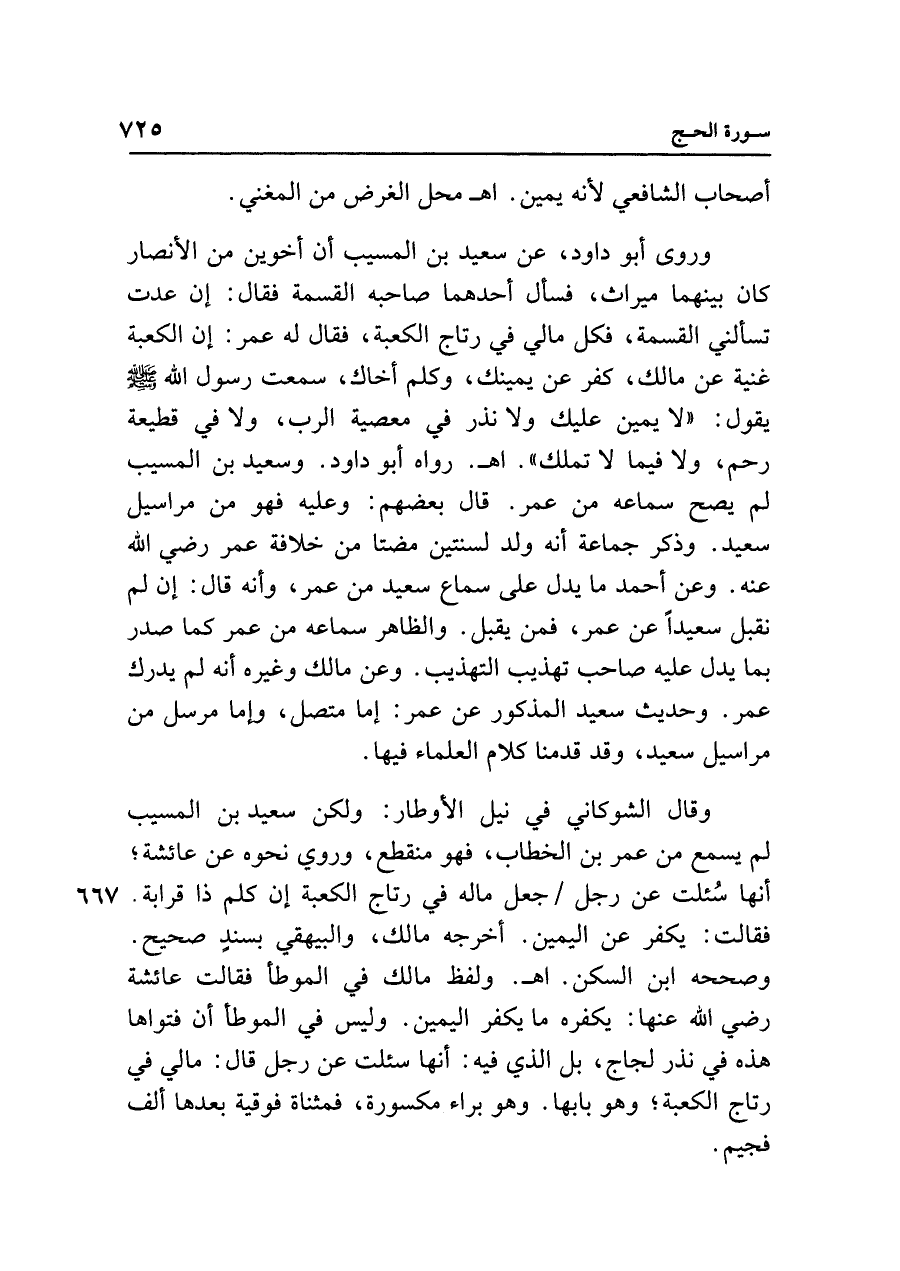 وروى أبو داود، عن سعيد بن المسيب أن أخوين من الأنصار كان بينهما ميراث، فسأل أحدهما صاحبه القسمة فقال: إن عدت تسألني القسمة، فكل مالي في رتاج الكعبة، فقال له عمر: إن الكعبة غنية عن مالك، كفر عن يمينك، وكلم أخاك، سمعت رسول الله - صلى الله عليه وسلم - يقول: "لا يمين عليك ولا نذر في معصية الرب، ولا في قطيعة رحم، ولا فيما لا تملك". اهـ. رواه أبو داود. وسعيد بن المسيب لم يصح سماعه من عمر. قال بعضهم: وعليه فهو من مراسيل سعيد. وذكر جماعة أنه ولد لسنتين مضتا من خلافة عمر رضي الله عنه. وعن أحمد ما يدل على سماع سعيد من عمر، وأنه قال: إن لم نقبل سعيدًا عن عمر، فمن يقبل. والظاهر سماعه من عمر كما صدر بما يدل عليه صاحب تهذيب التهذيب. وعن مالك وغيره أنه لم يدرك عمر. وحديث سعيد المذكور عن عمر: إما متصل، وإما مرسل من مراسيل سعيد، وقد قدمنا كلام العلماء فيها.