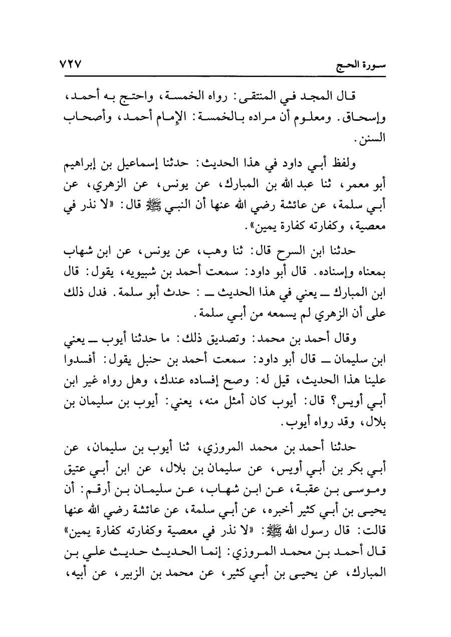 حدثنا أحمد بن محمد المروزي، ثنا أيوب بن سليمان، عن أبي بكر بن أبي أويس، عن سليمان بن بلال، عن ابن أبي عتيق وموسى بن عقبة، عن ابن شهاب، عن سليمان بن أرقم: أن يحيى بن أبي كثير أخبره، عن أبي سلمة، عن عائشة رضي الله عنها قالت: قال رسول الله - صلى الله عليه وسلم - : "لا نذر في معصية وكفارته كفارة يمين" قال أحمد بن محمد المروزي: إنما الحديث حديث علي بن المبارك، عن يحيى بن أبي كثير، عن محمد بن الزبير، عن أبيه،