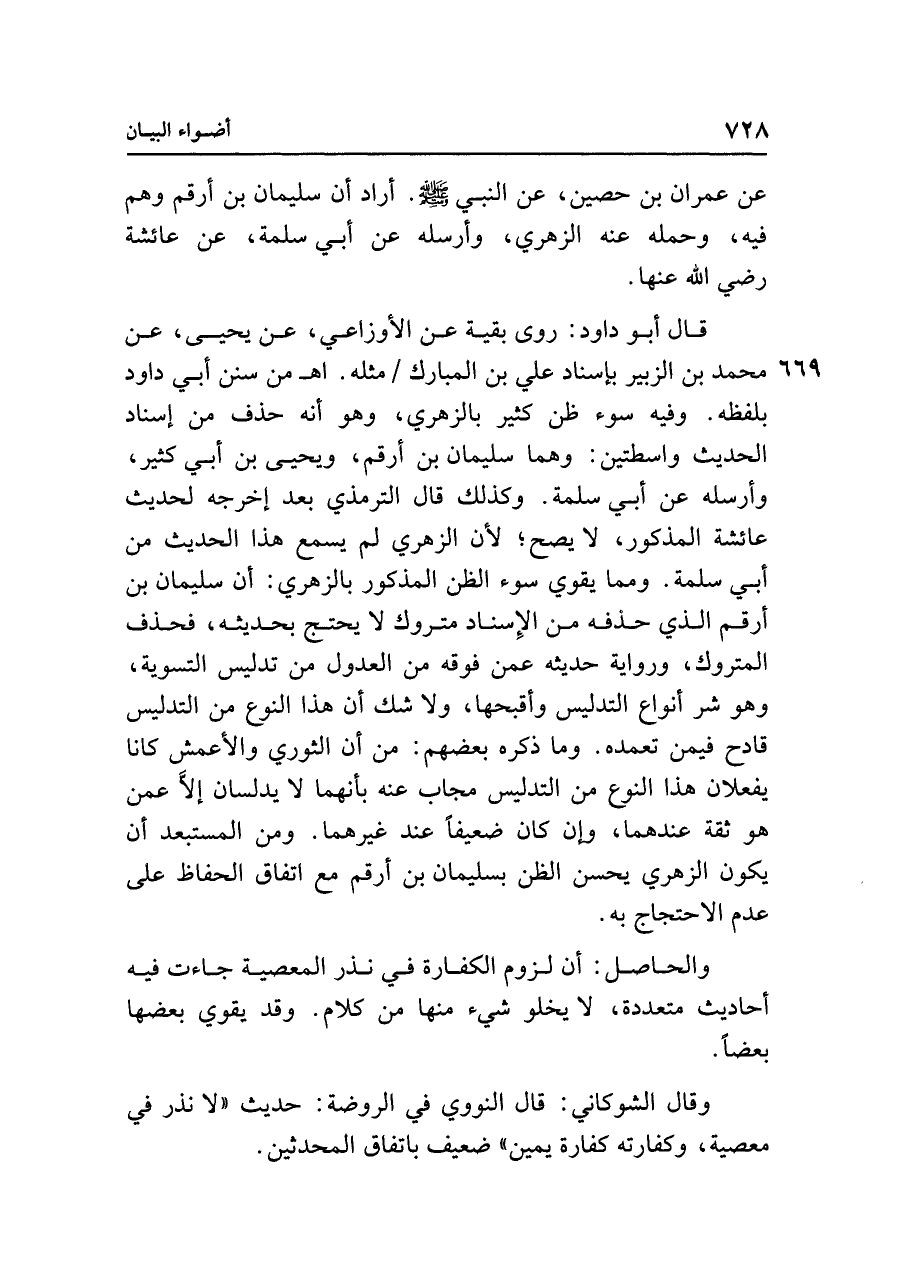 قال أبو داود: روى بقية عن الأوزاعي، عن يحيى، عن محمد بن الزبير بإسناد علي بن المبارك مثله. اهـ من سنن أبي داود بلفظه. وفيه سوء ظن كثير بالزهري، وهو أنه حذف من إسناد الحديث واسطتين: وهما سليمان بن أرقم، ويحيى بن أبي كثير، وأرسله عن أبي سلمة. وكذلك قال الترمذي بعد إخراجه لحديث عائشة المذكور، لا يصح؛ لأن الزهري لم يسمع هذا الحديث من أبي سلمة. ومما يقوي سوء الظن المذكور بالزهري: أن سليمان بن أرقم الذي حذفه من الإسناد متروك لا يحتج بحديثه، فحذف المتروك، ورواية حديثه عمن فوقه من العدول من تدليس التسوية، وهو شر أنواع التدليس وأقبحها، ولا شك أن هذا النوع من التدليس قادح فيمن تعمده. وما ذكره بعضهم: من أن الثوري والأعمش كانا يفعلان هذا النوع من التدليس مجاب عنه بأنهما لا يدلسان إلَّا عمن هو ثقة عندهما، وإن كان ضعيفًا عند غيرهما. ومن المستبعد أن يكون الزهري يحسن الظن بسليمان بن أرقم مع اتفاق الحفاظ على عدم الاحتجاج به.