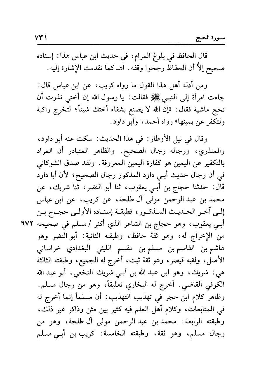 وقال في نيل الأوطار: في هذا الحديث: سكت عنه أبو داود، والمنذرى، ورجاله رجال الصحيح. والظاهر المتبادر أن المراد بالتكفير عن اليمين هو كفارة اليمين المعروفة. ولقد صدق الشوكاني في أن رجال حديث أبي داود المذكور رجال الصحيح، لأن أبا داود قال: حدثنا حجاج بن أبي يعقوب، ثنا أبو النضر، ثنا شريك، عن محمد بن عبد الرحمن مولى آل طلحة، عن كريب، عن ابن عباس إلى آخر الحديث المذكور، فطبقة إسناده الأولى حجاج بن أبي يعقوب، وهو حجاج بن الشاعر الذي أكثر مسلم في صحيحه من الإِخراج له، وهو ثقة حافظ، وطبقته الثانية: أبو النضر وهو هاشم بن القاسم بن مسلم بن مقسم الليثي البغدادي خراساني الأصل، ولقبه قيصر، وهو ثقة ثبت، أخرج له الجميع، وطبقته الثالثة هي: شريك، وهو ابن عبد الله بن أبي شريك النخعي، أبو عبد الله الكوفي القاضي. أخرج له البخاري تعليقًا، وهو من رجال مسلم. وظاهر كلام ابن حجر في تهذيب التهذيب: أن مسلمًا إنما أخرج له في المتابعات، وكلام أهل العلم فيه كثير بين مثن وذاكر غير ذلك، وطبقته الرابعة: محمد بن عبد الرحمن مولى آل طلحة، وهو من رجال مسلم، وهو ثقة، وطبقته الخامسة: كريب بن أبي مسلم