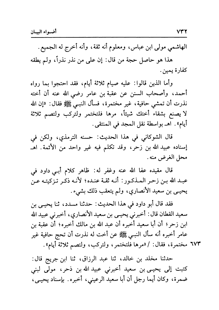 وأما الذين قالوا: عليه صيام ثلاثة أيام، فقد احتجوا بما رواه أحمد، وأصحاب السنن عن عقبة بن عامر رضي الله عنه أن أخته نذرت أن تمشي حافية، غير مختمرة، فسأل النبي - صلى الله عليه وسلم - فقال: "إن الله لا يصنع بشقاء أختك شيئًا، مرها فلتختمر ولتركب ولتصم ثلاثة أيام". اهـ بواسطة نقل المجد في المنتقى.