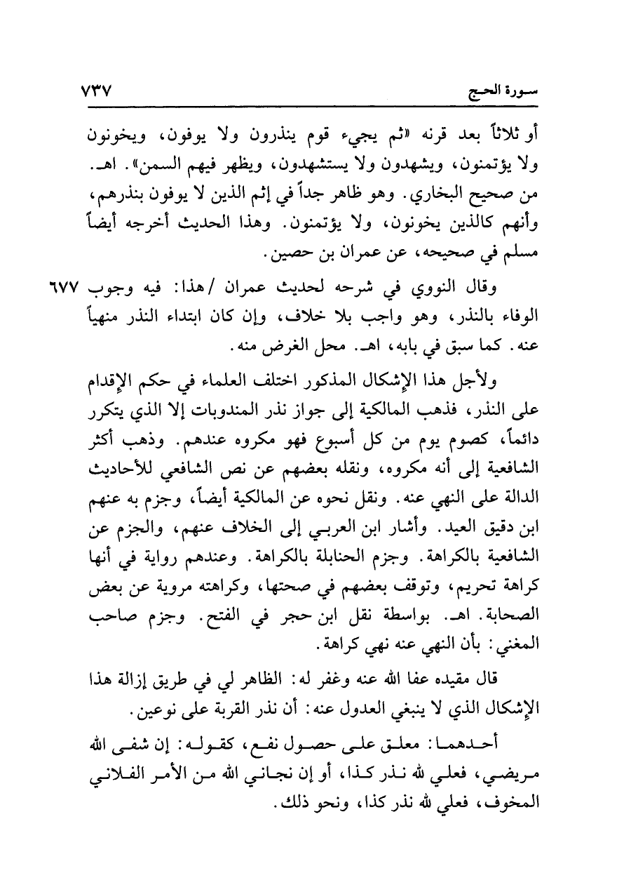 وقال النووي في شرحه لحديث عمران هذا: فيه وجوب الوفاء بالنذر، وهو واجب بلا خلاف، وإن كان ابتداء النذر منهيًا عنه. كما سبق في بابه، اهـ. محل الغرض منه.