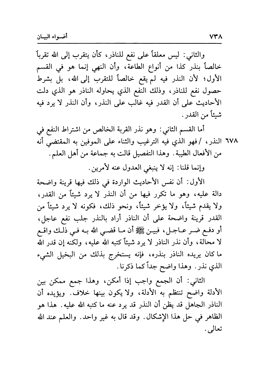 الثاني: أن الجمع واجب إذا أمكن، وهذا جمع ممكن بين الأدلة واضح تنتظم به الأدلة، ولا يكون بينها خلاف. ويؤيده أن الناذر الجاهل قد يظن أن النذر قد يرد عنه ما كتبه الله عليه. هذا هو الظاهر في حل هذا الإِشكال. وقد قال به غير واحد. والعلم عند الله تعالى.