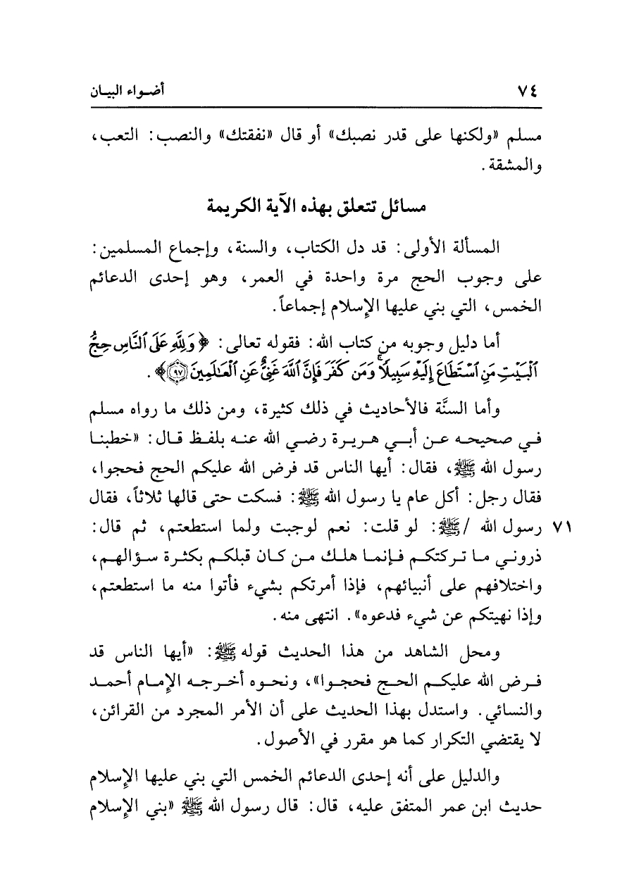 المسألة الأولى: قد دل الكتاب، والسنة، وإجماع المسلمين: على وجوب الحج مرة واحدة في العمر، وهو إحدى الدعائم الخمس، التي بني عليها الإِسلام إجماعًا.