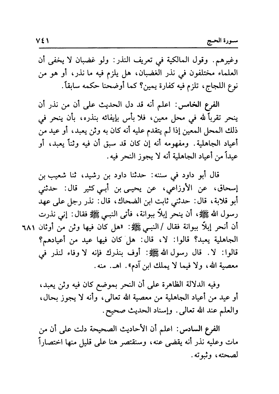 الفرع الخامس: اعلم أنه قد دل الحديث على أن من نذر أن ينحر تقربًا للَّه في محل معين، فلا بأس بإيفائه بنذره، بأن ينحر في ذلك المحل المعين إذا لم يتقدم عليه أنه كان به وثن يعبد، أو عيد من أعياد الجاهلية. ومفهومه أنه إن كان قد سبق أن فيه وثنًا يعبد، أو عيدًا من أعياد الجاهلية أنه لا يجوز النحر فيه.