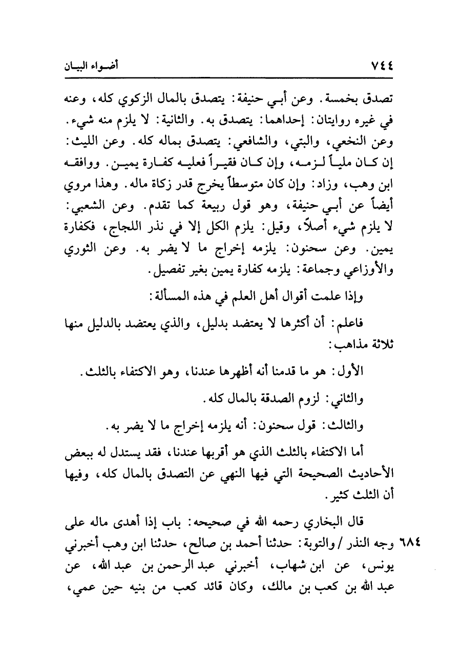 قال البخاري رحمه الله في صحيحه: باب إذا أهدى ماله على وجه النذر والتوبة: حدثنا أحمد بن صالح، حدثنا ابن وهب أخبرني يونس، عن ابن شهاب، أخبرني عبد الرحمن بن عبد الله، عن عبد الله بن كعب بن مالك، وكان قائد كعب من بنيه حين عمي،