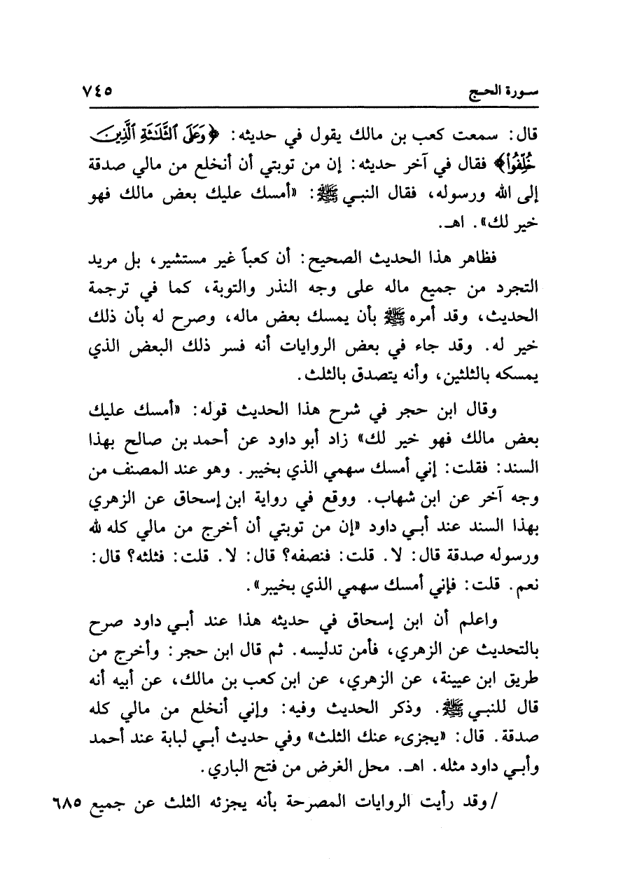 وقال ابن حجر في شرح هذا الحديث قوله: "أمسك عليك بعض مالك فهو خير لك" زاد أبو داود عن أحمد بن صالح بهذا السند: فقلت: إني أمسك سهمي الذي بخيبر. وهو عند المصنف من وجه آخر عن ابن شهاب. ووقع في رواية ابن إسحاق عن الزهري بهذا السند عند أبي داود "إن من توبتي أن أخرج من مالي كله للَّه ورسوله صدقة قال: لا. قلت: فنصفه؟ قال: لا. قلت: فثلثه؟ قال: نعم. قلت: فإني أمسك سهمي الذي بخيبر".