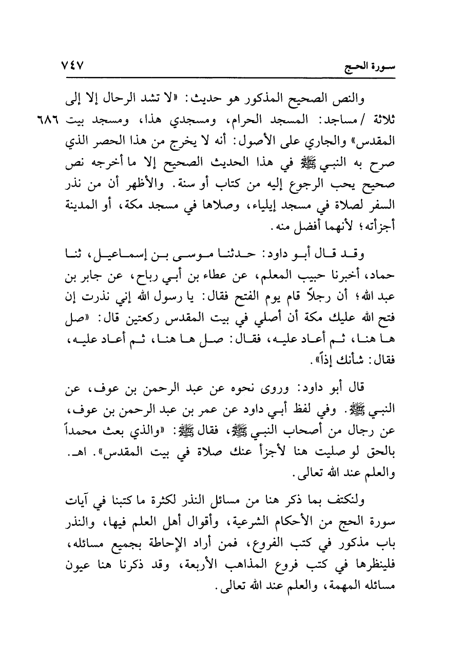 والنص الصحيح المذكور هو حديث: "لا تشد الرحال إلا إلى ثلاثة مساجد: المسجد الحرام، ومسجدي هذا، ومسجد بيت المقدس" والجاري على الأصول. أنه لا يخرج من هذا الحصر الذي صرح به النبي - صلى الله عليه وسلم - في هذا الحديث الصحيح إلا ما أخرجه نص صحيح يحب الرجوع إليه من كتاب أو سنة. والأظهر أن من نذر السفر لصلاة في مسجد إيلياء، وصلاها في مسجد مكة، أو المدينة أجزأته، لأنهما أفضل منه.