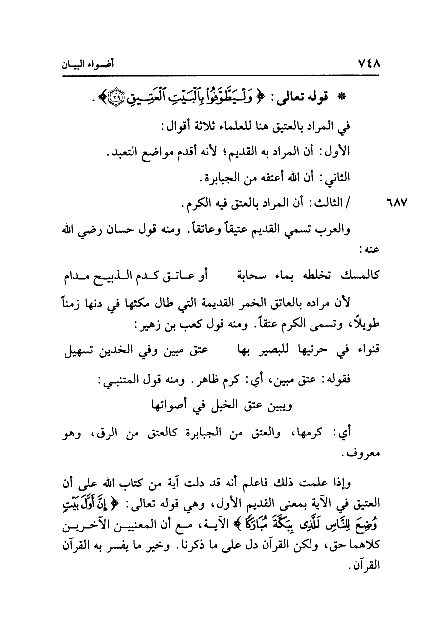 وإذا علمت ذلك فاعلم أنه قد دلت آية من كتاب الله على أن العتيق في الآية بمعنى القديم الأول، وهي قوله تعالى: {إِنَّ أَوَّلَ بَيْتٍ وُضِعَ لِلنَّاسِ لَلَّذِي بِبَكَّةَ مُبَارَكًا} الآية، مع أن المعنيين الآخرين كلاهما حق، ولكن القرآن دل على ما ذكرنا. وخير ما يفسر به القرآن القرآن.